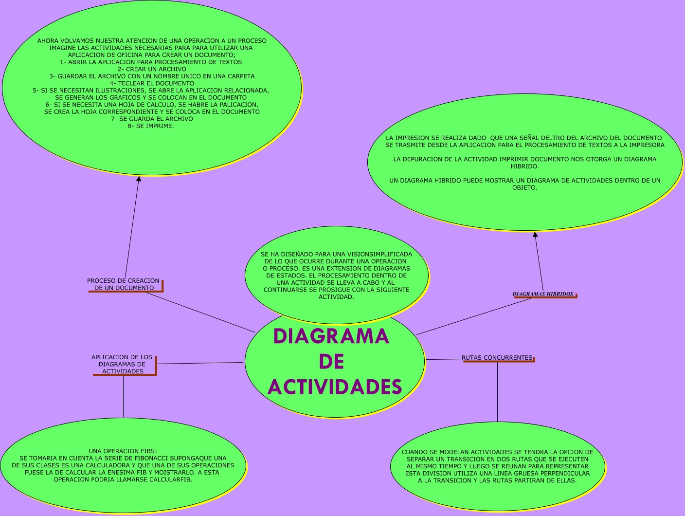 Este Cmap, tiene información relacionada con: david91, DIAGRAMA DE ACTIVIDADES DIAGRAMAS HIBRIDOS LA IMPRESION SE REALIZA DADO QUE UNA SEÑAL DELTRO DEL ARCHIVO DEL DOCUMENTO SE TRASMITE DESDE LA APLICACION PARA EL PROCESAMIENTO DE TEXTOS A LA IMPRESORA LA DEPURACION DE LA ACTIVIDAD IMPRIMIR DOCUMENTO NOS OTORGA UN DIAGRAMA HIBRIDO. UN DIAGRAMA HIBRIDO PUEDE MOSTRAR UN DIAGRAMA DE ACTIVIDADES DENTRO DE UN OBJETO., DIAGRAMA DE ACTIVIDADES PROCESO DE CREACION DE UN DOCUMENTO AHORA VOLVAMOS NUESTRA ATENCION DE UNA OPERACION A UN PROCESO IMAGINE LAS ACTIVIDADES NECESARIAS PARA PARA UTILIZAR UNA APLICACION DE OFICINA PARA CREAR UN DOCUMENTO; 1- ABRIR LA APLICACION PARA PROCESAMIENTO DE TEXTOS 2- CREAR UN ARCHIVO 3- GUARDAR EL ARCHIVO CON UN NOMBRE UNICO EN UNA CARPETA 4- TECLEAR EL DOCUMENTO 5- SI SE NECESITAN ILUSTRACIONES, SE ABRE LA APLICACION RELACIONADA, SE GENERAN LOS GRAFICOS Y SE COLOCAN EN EL DOCUMENTO 6- SI SE NECESITA UNA HOJA DE CALCULO, SE HABRE LA PALICACION, SE CREA LA HOJA CORRESPONDIENTE Y SE COLOCA EN EL DOCUMENTO 7- SE GUARDA EL ARCHIVO 8- SE IMPRIME., DIAGRAMA DE ACTIVIDADES APLICACION DE LOS DIAGRAMAS DE ACTIVIDADES UNA OPERACION FIBS: SE TOMARIA EN CUENTA LA SERIE DE FIBONACCI SUPONGAQUE UNA DE SUS CLASES ES UNA CALCULADORA Y QUE UNA DE SUS OPERACIONES FUESE LA DE CALCULAR LA ENESIMA FIB Y MOISTRARLO. A ESTA OPERACION PODRIA LLAMARSE CALCULARFIB., DIAGRAMA DE ACTIVIDADES RUTAS CONCURRENTES CUANDO SE MODELAN ACTIVIDADES SE TENDRA LA OPCION DE SEPARAR UN TRANSICION EN DOS RUTAS QUE SE EJECUTEN AL MISMO TIEMPO Y LUEGO SE REUNAN PARA REPRESENTAR ESTA DIVISION UTILIZA UNA LINEA GRUESA PERPENDICULAR A LA TRANSICION Y LAS RUTAS PARTIRAN DE ELLAS.