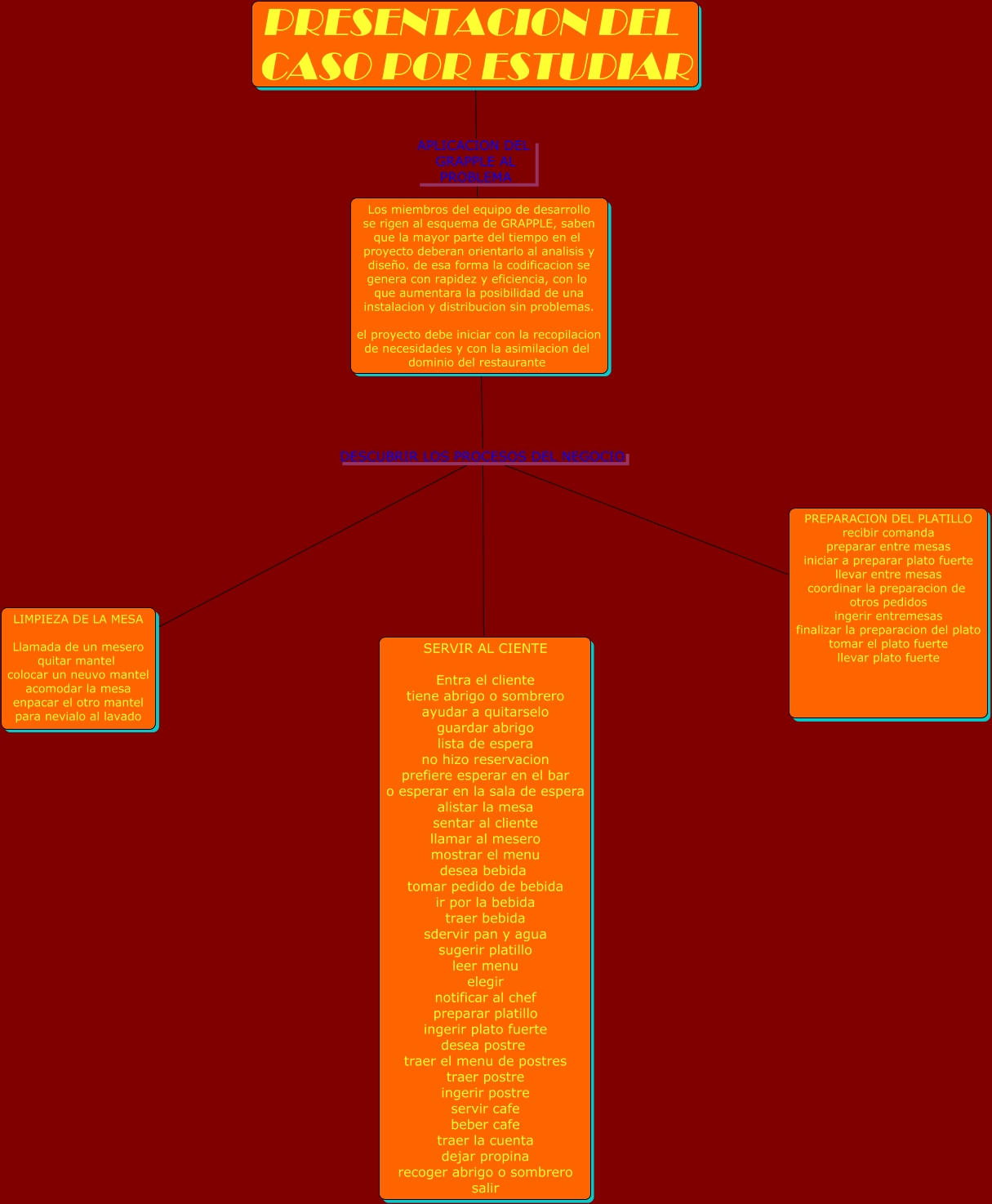 Este Cmap, tiene información relacionada con: david96, Los miembros del equipo de desarrollo se rigen al esquema de GRAPPLE, saben que la mayor parte del tiempo en el proyecto deberan orientarlo al analisis y diseño. de esa forma la codificacion se genera con rapidez y eficiencia, con lo que aumentara la posibilidad de una instalacion y distribucion sin problemas. el proyecto debe iniciar con la recopilacion de necesidades y con la asimilacion del dominio del restaurante DESCUBRIR LOS PROCESOS DEL NEGOCIO PREPARACION DEL PLATILLO recibir comanda preparar entre mesas iniciar a preparar plato fuerte llevar entre mesas coordinar la preparacion de otros pedidos ingerir entremesas finalizar la preparacion del plato tomar el plato fuerte llevar plato fuerte, Los miembros del equipo de desarrollo se rigen al esquema de GRAPPLE, saben que la mayor parte del tiempo en el proyecto deberan orientarlo al analisis y diseño. de esa forma la codificacion se genera con rapidez y eficiencia, con lo que aumentara la posibilidad de una instalacion y distribucion sin problemas. el proyecto debe iniciar con la recopilacion de necesidades y con la asimilacion del dominio del restaurante DESCUBRIR LOS PROCESOS DEL NEGOCIO LIMPIEZA DE LA MESA Llamada de un mesero quitar mantel colocar un neuvo mantel acomodar la mesa enpacar el otro mantel para nevialo al lavado, PRESENTACION DEL CASO POR ESTUDIAR APLICACION DEL GRAPPLE AL PROBLEMA Los miembros del equipo de desarrollo se rigen al esquema de GRAPPLE, saben que la mayor parte del tiempo en el proyecto deberan orientarlo al analisis y diseño. de esa forma la codificacion se genera con rapidez y eficiencia, con lo que aumentara la posibilidad de una instalacion y distribucion sin problemas. el proyecto debe iniciar con la recopilacion de necesidades y con la asimilacion del dominio del restaurante, Los miembros del equipo de desarrollo se rigen al esquema de GRAPPLE, saben que la mayor parte del tiempo en el proyecto deberan orientarlo al analisis y diseño. de esa forma la codificacion se genera con rapidez y eficiencia, con lo que aumentara la posibilidad de una instalacion y distribucion sin problemas. el proyecto debe iniciar con la recopilacion de necesidades y con la asimilacion del dominio del restaurante DESCUBRIR LOS PROCESOS DEL NEGOCIO SERVIR AL CIENTE Entra el cliente tiene abrigo o sombrero ayudar a quitarselo guardar abrigo lista de espera no hizo reservacion prefiere esperar en el bar o esperar en la sala de espera alistar la mesa sentar al cliente llamar al mesero mostrar el menu desea bebida tomar pedido de bebida ir por la bebida traer bebida sdervir pan y agua sugerir platillo leer menu elegir notificar al chef preparar platillo ingerir plato fuerte desea postre traer el menu de postres traer postre ingerir postre servir cafe beber cafe traer la cuenta dejar propina recoger abrigo o sombrero salir