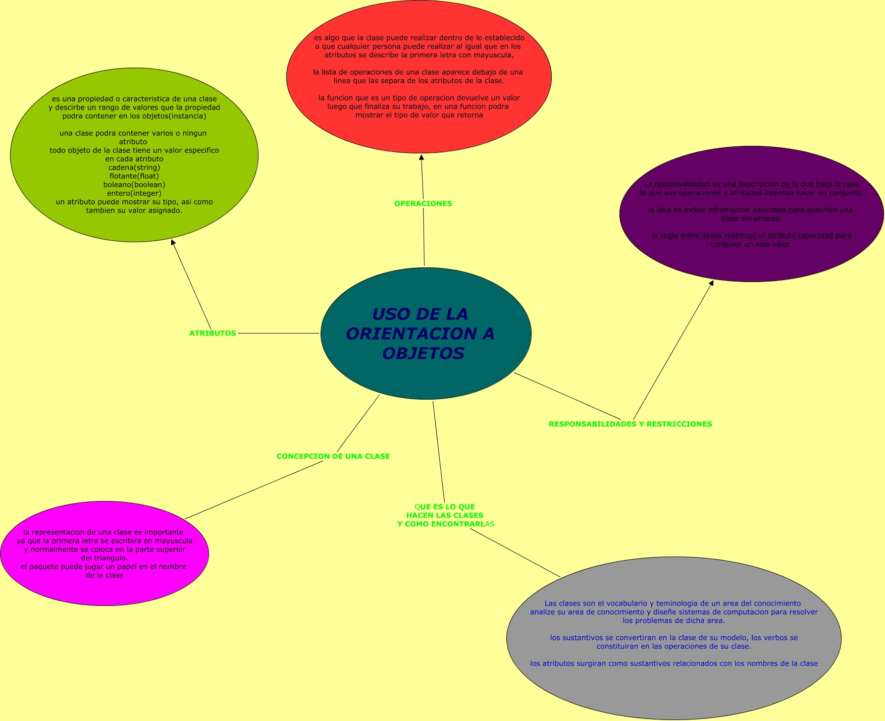 Este Cmap, tiene información relacionada con: david3, USO DE LA ORIENTACION A OBJETOS RESPONSABILIDADES Y RESTRICCIONES La responsabilidad es una descripcion de lo que hara la case lo que sus operaciones y atributos intentan hacer en conjunto. la idea es incluir infromacion adecuada para describir una clase sin errores. la regla entre llaves restringe al atributo capacidad para contener un solo valor, USO DE LA ORIENTACION A OBJETOS ATRIBUTOS es una propiedad o caracteristica de una clase y descirbe un rango de valores que la propiedad podra contener en los objetos(instancia) una clase podra contener varios o ningun atributo todo objeto de la clase tiene un valor especifico en cada atributo cadena(string) flotante(float) boleano(boolean) entero(integer) un atributo puede mostrar su tipo, asi como tambien su valor asignado., USO DE LA ORIENTACION A OBJETOS CONCEPCION DE UNA CLASE la representacion de una clase es importante ya que la primera letra se escribira en mayuscula y normalmente se coloca en la parte superior del triangulo. el paquete puede jugar un papel en el nombre de la clase, USO DE LA ORIENTACION A OBJETOS QUE ES LO QUE HACEN LAS CLASES Y COMO ENCONTRARLAS Las clases son el vocabulario y teminologia de un area del conocimiento analize su area de conocimiento y diseñe sistemas de computacion para resolver los problemas de dicha area. los sustantivos se convertiran en la clase de su modelo, los verbos se constituiran en las operaciones de su clase. los atributos surgiran como sustantivos relacionados con los nombres de la clase, USO DE LA ORIENTACION A OBJETOS OPERACIONES es algo que la clase puede realizar dentro de lo establecido o que cualquier persona puede realizar al igual que en los atributos se describe la primera letra con mayuscula, la lista de operaciones de una clase aparece debajo de una linea que las separa de los atributos de la clase. la funcion que es un tipo de operacion devuelve un valor luego que finaliza su trabajo, en una funcion podra mostrar el tipo de valor que retorna