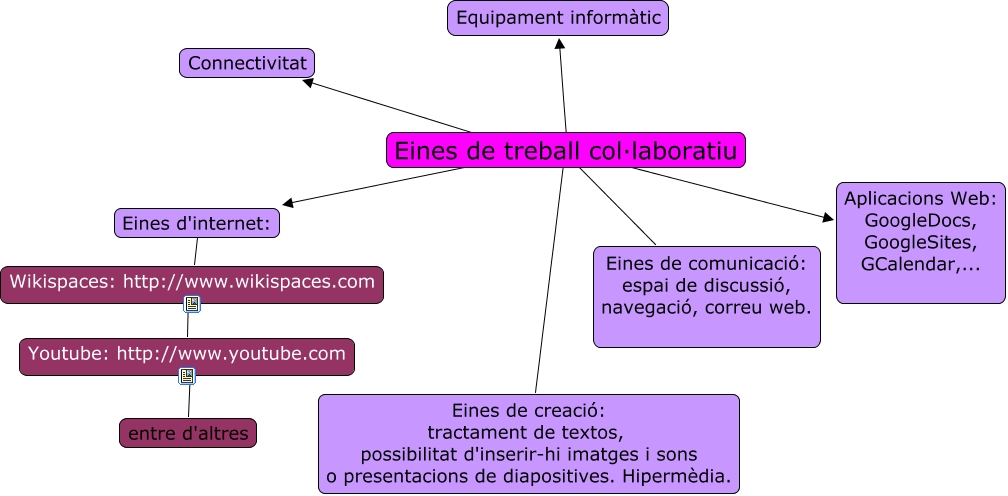 Este Cmap, tiene información relacionada con: eines, Wikispaces: http://www.wikispaces.com ???? Youtube: http://www.youtube.com, Eines de treball col·laboratiu ???? Eines de comunicació: espai de discussió, navegació, correu web., Eines de treball col·laboratiu ???? Eines d'internet:, Eines de treball col·laboratiu ???? Equipament informàtic, Eines de treball col·laboratiu ???? Connectivitat, Eines de treball col·laboratiu ???? Eines de creació: tractament de textos, possibilitat d'inserir-hi imatges i sons o presentacions de diapositives. Hipermèdia., Eines d'internet: ???? Wikispaces: http://www.wikispaces.com, Eines de treball col·laboratiu ???? Aplicacions Web: GoogleDocs, GoogleSites, GCalendar,..., Youtube: http://www.youtube.com ???? entre d'altres