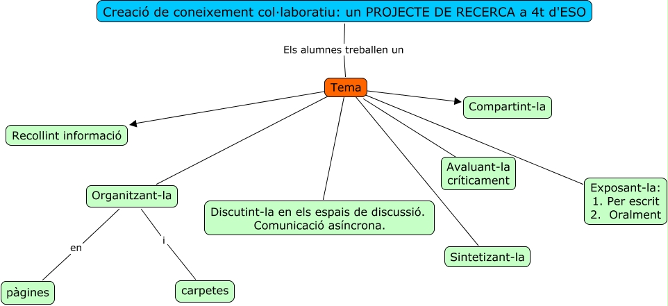 Este Cmap, tiene información relacionada con: Tasca, Tema ???? Recollint informació, Tema ???? Organitzant-la, Organitzant-la i carpetes, Tema ???? Discutint-la en els espais de discussió. Comunicació asíncrona., Tema ???? Avaluant-la críticament, Organitzant-la en pàgines, Tema ???? Exposant-la: 1. Per escrit 2. Oralment, Tema ???? Compartint-la, Tema ???? Sintetizant-la, Creació de coneixement col·laboratiu: un PROJECTE DE RECERCA a 4t d'ESO Els alumnes treballen un Tema