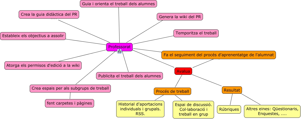 Este Cmap, tiene información relacionada con: professorat, Professorat ???? Fa el seguiment del procés d'aprenentatge de l'alumnat, Avalua ???? Fa el seguiment del procés d'aprenentatge de l'alumnat, Professorat ???? Guia i orienta el treball dels alumnes, Professorat ???? Publicita el treball dels alumnes, Avalua ???? Resultat, Crea espais per als subgrups de treball ???? fent carpetes i pàgines, Resultat ???? Rúbriques, Professorat ???? Estableix els objectius a assolir, Avalua ???? Procés de treball, Professorat ???? Avalua, Professorat ???? Temporitza el treball, Professorat ???? Crea la guia didàctica del PR, Professorat ???? Genera la wiki del PR, Procés de treball ???? Historial d'aportacions individuals i grupals. RSS., Resultat ???? Altres eines: Qüestionaris, Enquestes, ...., Professorat ???? Atorga els permisos d'edició a la wiki, Procés de treball ???? Espai de discussió. Col·laboració i treball en grup, Professorat ???? Crea espais per als subgrups de treball