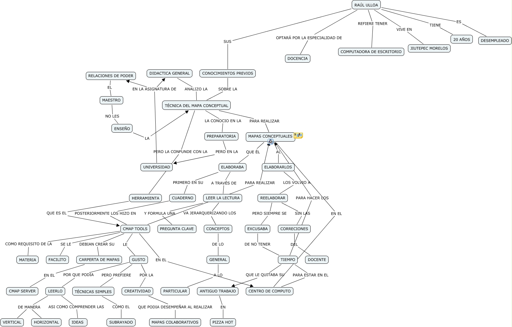 Este Cmap, tiene información relacionada con: ENTREVISTA DE RAÚL ULLLOA, RAÚL ULLOA REFIERE TENER COMPUTADORA DE ESCRITORIO, GUSTO PERO PREFIERE TÉCNICAS SIMPLES, CMAP TOOLS COMO REQUISITO DE LA MATERIA, MAPAS CONCEPTUALES EN EL CENTRO DE COMPUTO, RAÚL ULLOA OPTARÁ POR LA ESPECIALIDAD DE DOCENCIA, TÉCNICA DEL MAPA CONCEPTUAL PARA REALIZAR MAPAS CONCEPTUALES, LEER LA LECTURA Y FORMULA UNA PREGUNTA CLAVE, EXCUSABA DE NO TENER TIEMPO, LEERLO DE MANERA HORIZONTAL, CMAP TOOLS SE LE FACILITO, ELABORABA PRIMERO EN SU CUADERNO, TÉCNICA DEL MAPA CONCEPTUAL PERO LA CONFUNDE CON LA HERRAMIENTA, CONCEPTOS DE LO GENERAL, ENSEÑO LA TÉCNICA DEL MAPA CONCEPTUAL, ELABORABA A TRAVÉS DE LEER LA LECTURA, CUADERNO POSTERIORMENTE LOS HIZO EN CMAP TOOLS, UNIVERSIDAD EN LA ASIGNATURA DE RELACIONES DE PODER, ELABORARLOS LOS VOLVIO A REELABORAR, DIDACTICA GENERAL ANALIZO LA TÉCNICA DEL MAPA CONCEPTUAL, CONOCIMIENTOS PREVIOS SOBRE LA TÉCNICA DEL MAPA CONCEPTUAL