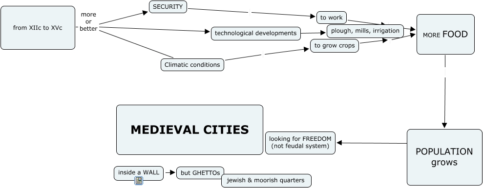 Este mapa conceptual tiene información relacionada a: medieval cities 1, Climatic conditions to grow crops, from XIIc to XVc more or better SECURITY, SECURITY to work, MORE FOOD POPULATION grows, POPULATION grows ???? looking for FREEDOM (not feudal system), from XIIc to XVc more or better Climatic conditions, from XIIc to XVc more or better technological developments, to grow crops MORE FOOD, to work MORE FOOD, inside a WALL ???? but GHETTOs