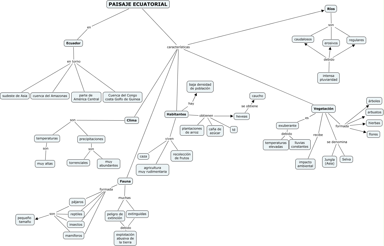 Este Cmap, tiene información relacionada con: Ecuatorial 1-8, intensa pluviaridad debido caudalosos, intensa pluviaridad debido erosivos, Vegetación formada arbustos, precipitaciones son torrenciales, exuberante debido temperaturas elevadas, Habitantes obtienen té, PAISAJE ECUATORIAL características Fauna, Clima son temperaturas, Ríos son regulares, PAISAJE ECUATORIAL características Vegetación, Ecuador en torno parte de América Central, peligro de extinción debido explotación abusiva de la tierra, Fauna formada mamíferos, Fauna muchas extinguidas, Ecuador en torno sudeste de Asia, Habitantes obtienen caña de azúcar, Fauna muchas peligro de extinción, Ecuador en torno Cuenca del Congo costa Golfo de Guinea, pájaros son pequeño tamaño, extinguidas debido explotación abusiva de la tierra