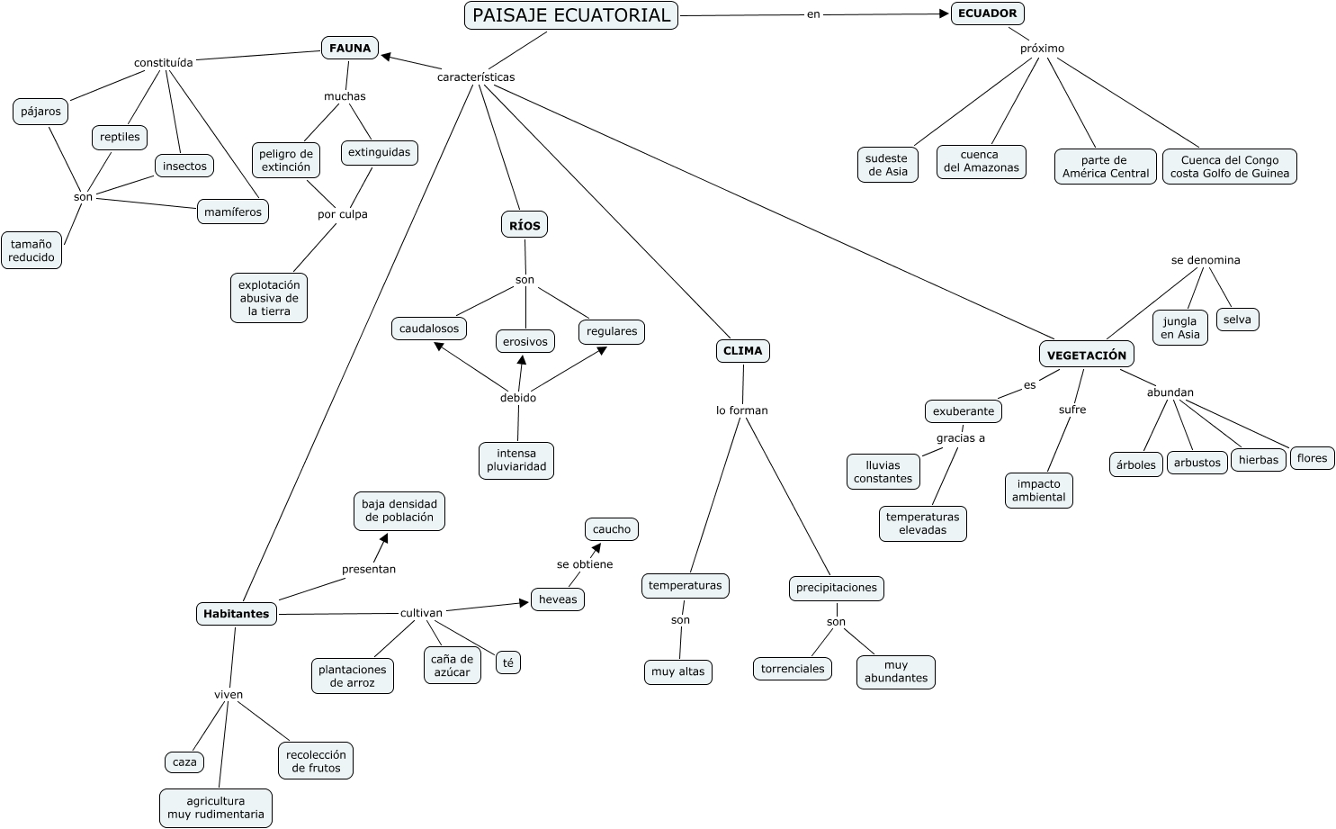 Este Cmap, tiene información relacionada con: Ecuatorial 1-8 def, intensa pluviaridad debido caudalosos, intensa pluviaridad debido erosivos, VEGETACIÓN abundan arbustos, precipitaciones son torrenciales, exuberante gracias a temperaturas elevadas, Habitantes cultivan té, PAISAJE ECUATORIAL características FAUNA, CLIMA lo forman temperaturas, RÍOS son regulares, PAISAJE ECUATORIAL características VEGETACIÓN, ECUADOR próximo parte de América Central, peligro de extinción por culpa explotación abusiva de la tierra, FAUNA constituída mamíferos, FAUNA muchas extinguidas, ECUADOR próximo sudeste de Asia, Habitantes cultivan caña de azúcar, FAUNA muchas peligro de extinción, ECUADOR próximo Cuenca del Congo costa Golfo de Guinea, pájaros son tamaño reducido, extinguidas por culpa explotación abusiva de la tierra