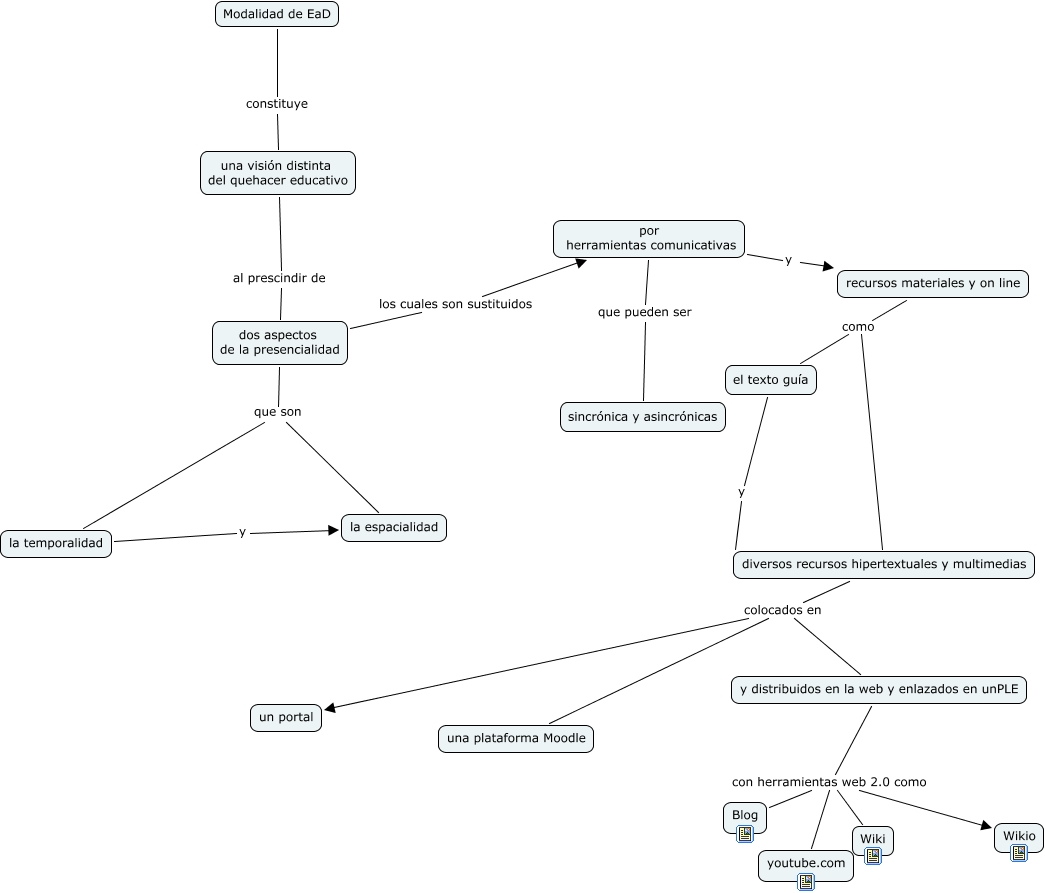 Este Cmap, tiene información relacionada con: ple final jghb1976, por herramientas comunicativas y recursos materiales y on line, dos aspectos de la presencialidad que son la espacialidad, recursos materiales y on line como diversos recursos hipertextuales y multimedias, diversos recursos hipertextuales y multimedias colocados en y distribuidos en la web y enlazados en unPLE, el texto guía y diversos recursos hipertextuales y multimedias, y distribuidos en la web y enlazados en unPLE con herramientas web 2.0 como Wiki, diversos recursos hipertextuales y multimedias colocados en una plataforma Moodle, dos aspectos de la presencialidad los cuales son sustituidos por herramientas comunicativas, Modalidad de EaD constituye una visión distinta del quehacer educativo, diversos recursos hipertextuales y multimedias colocados en un portal, una visión distinta del quehacer educativo al prescindir de dos aspectos de la presencialidad, y distribuidos en la web y enlazados en unPLE con herramientas web 2.0 como Blog, y distribuidos en la web y enlazados en unPLE con herramientas web 2.0 como Wikio, por herramientas comunicativas que pueden ser sincrónica y asincrónicas, recursos materiales y on line como el texto guía, dos aspectos de la presencialidad que son la temporalidad, y distribuidos en la web y enlazados en unPLE con herramientas web 2.0 como youtube.com, la temporalidad y la espacialidad