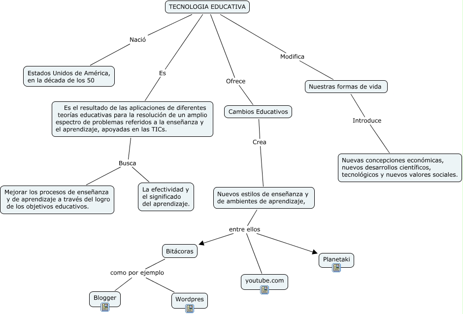 Este Cmap, tiene información relacionada con: CMaps Final TECNOLOGIA EDUCATIVA, Bitácoras como por ejemplo Blogger, Es el resultado de las aplicaciones de diferentes teorías educativas para la resolución de un amplio espectro de problemas referidos a la enseñanza y el aprendizaje, apoyadas en las TICs. Busca Mejorar los procesos de enseñanza y de aprendizaje a través del logro de los objetivos educativos., Nuevos estilos de enseñanza y de ambientes de aprendizaje, entre ellos Planetaki, Cambios Educativos Crea Nuevos estilos de enseñanza y de ambientes de aprendizaje,, TECNOLOGIA EDUCATIVA Nació Estados Unidos de América, en la década de los 50, Nuestras formas de vida Introduce Nuevas concepciones económicas, nuevos desarrollos científicos, tecnológicos y nuevos valores sociales., Es el resultado de las aplicaciones de diferentes teorías educativas para la resolución de un amplio espectro de problemas referidos a la enseñanza y el aprendizaje, apoyadas en las TICs. Busca La efectividad y el significado del aprendizaje., Nuevos estilos de enseñanza y de ambientes de aprendizaje, entre ellos Bitácoras, Bitácoras como por ejemplo Wordpres, Nuevos estilos de enseñanza y de ambientes de aprendizaje, entre ellos youtube.com, TECNOLOGIA EDUCATIVA Ofrece Cambios Educativos, TECNOLOGIA EDUCATIVA Es Es el resultado de las aplicaciones de diferentes teorías educativas para la resolución de un amplio espectro de problemas referidos a la enseñanza y el aprendizaje, apoyadas en las TICs., TECNOLOGIA EDUCATIVA Modifica Nuestras formas de vida