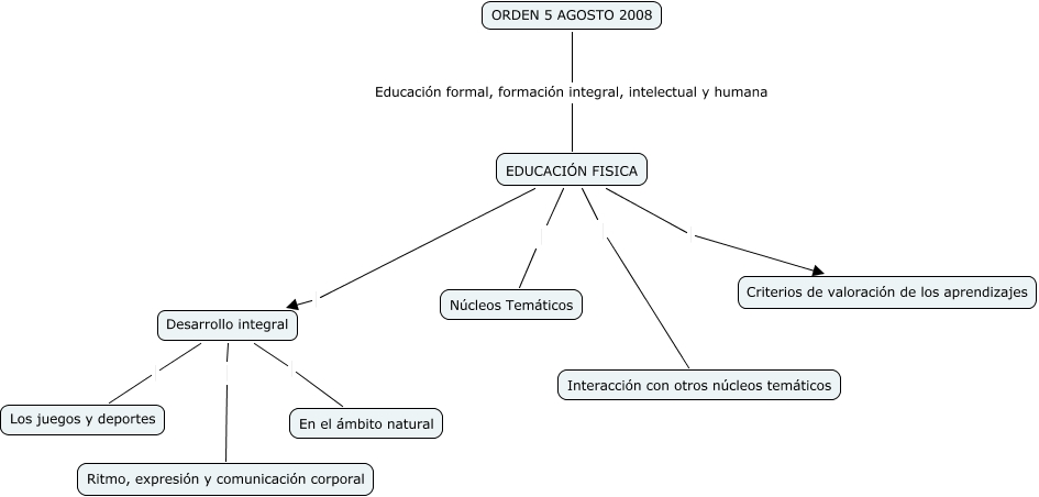 Este Cmap, tiene información relacionada con: orden5 enseñanza, EDUCACIÓN FISICA Desarrollo integral, EDUCACIÓN FISICA Núcleos Temáticos, Desarrollo integral En el ámbito natural, Desarrollo integral Ritmo, expresión y comunicación corporal, EDUCACIÓN FISICA Criterios de valoración de los aprendizajes, ORDEN 5 AGOSTO 2008 Educación formal, formación integral, intelectual y humana EDUCACIÓN FISICA, Desarrollo integral Los juegos y deportes, EDUCACIÓN FISICA Interacción con otros núcleos temáticos