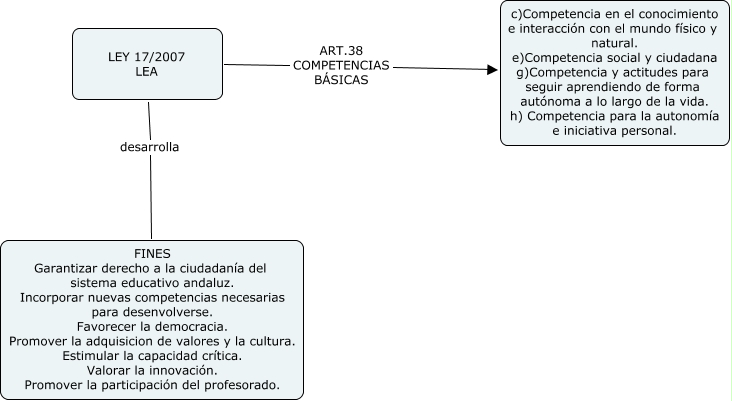 Este Cmap, tiene información relacionada con: LEA, LEY 17/2007 LEA desarrolla FINES Garantizar derecho a la ciudadanía del sistema educativo andaluz. Incorporar nuevas competencias necesarias para desenvolverse. Favorecer la democracia. Promover la adquisicion de valores y la cultura. Estimular la capacidad crítica. Valorar la innovación. Promover la participación del profesorado., LEY 17/2007 LEA ART.38 COMPETENCIAS BÁSICAS c)Competencia en el conocimiento e interacción con el mundo físico y natural. e)Competencia social y ciudadana g)Competencia y actitudes para seguir aprendiendo de forma autónoma a lo largo de la vida. h) Competencia para la autonomía e iniciativa personal.