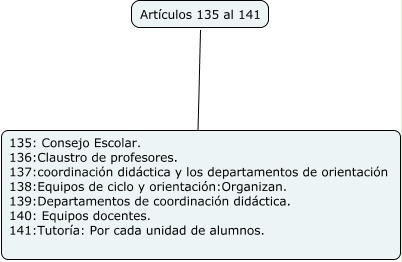 Este Cmap, tiene información relacionada con: ARTÍCULOS 135 A 141, Artículos 135 al 141 ???? 135: Consejo Escolar. 136:Claustro de profesores. 137:coordinación didáctica y los departamentos de orientación 138:Equipos de ciclo y orientación:Organizan. 139:Departamentos de coordinación didáctica. 140: Equipos docentes. 141:Tutoría: Por cada unidad de alumnos.