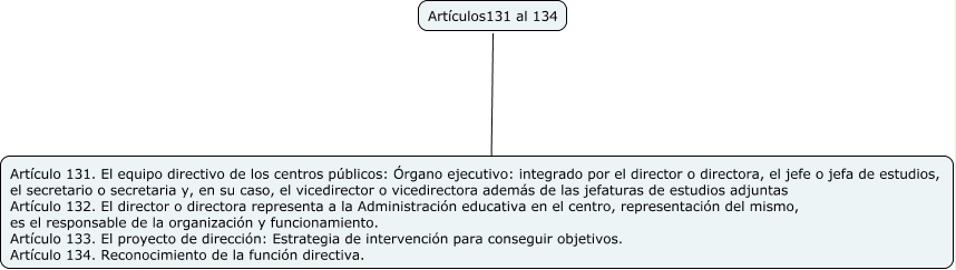 Este Cmap, tiene información relacionada con: ARTÍCULOS 131 A 134, Artículos131 al 134 ???? Artículo 131. El equipo directivo de los centros públicos: Órgano ejecutivo: integrado por el director o directora, el jefe o jefa de estudios, el secretario o secretaria y, en su caso, el vicedirector o vicedirectora además de las jefaturas de estudios adjuntas Artículo 132. El director o directora representa a la Administración educativa en el centro, representación del mismo, es el responsable de la organización y funcionamiento. Artículo 133. El proyecto de dirección: Estrategia de intervención para conseguir objetivos. Artículo 134. Reconocimiento de la función directiva.
