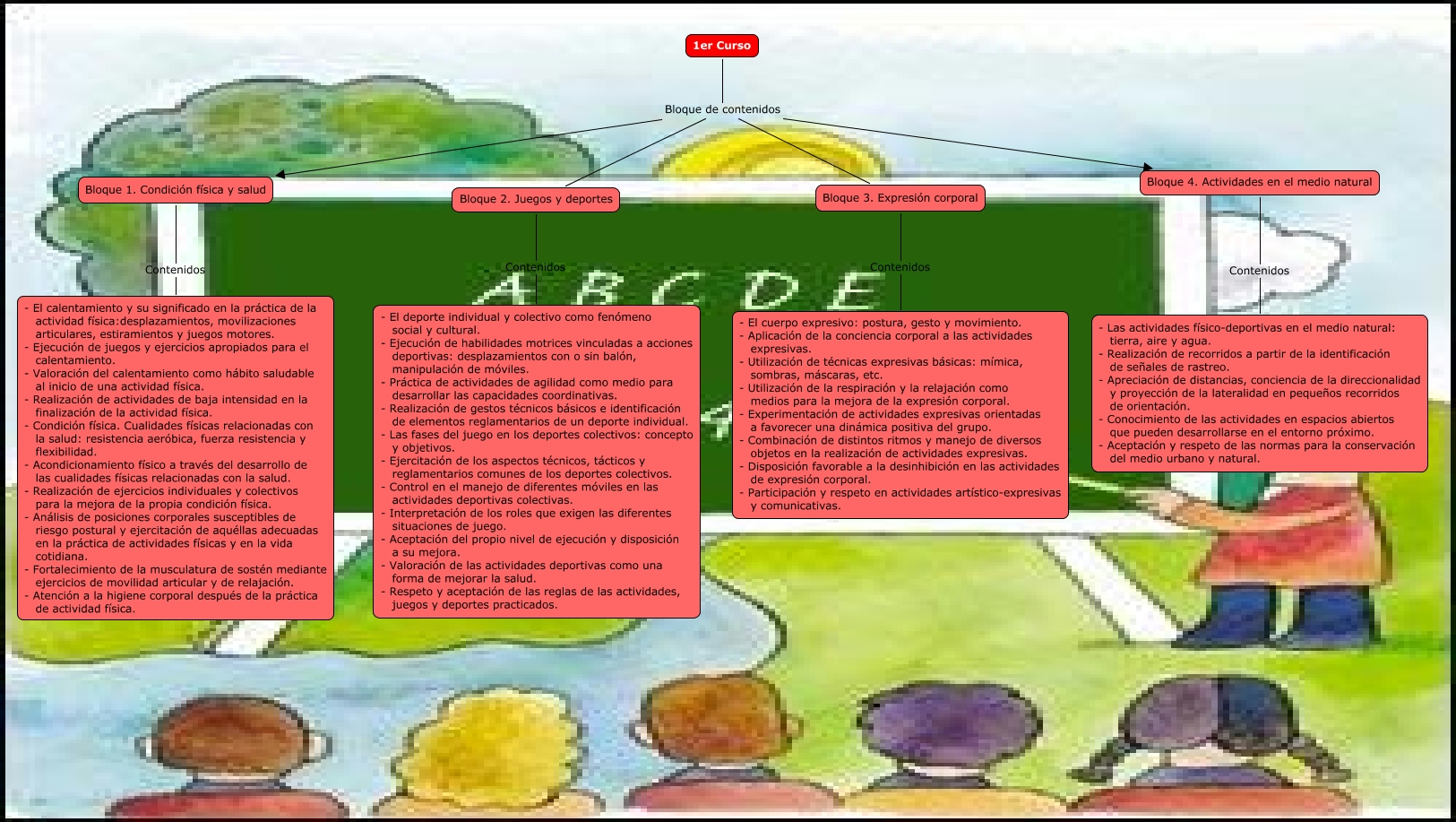 Este Cmap, tiene información relacionada con: 1er curso, 1er Curso Bloque de contenidos Bloque 1. Condición física y salud, 1er Curso Bloque de contenidos Bloque 4. Actividades en el medio natural, Bloque 4. Actividades en el medio natural Contenidos - Las actividades físico-deportivas en el medio natural: tierra, aire y agua. - Realización de recorridos a partir de la identificación de señales de rastreo. - Apreciación de distancias, conciencia de la direccionalidad y proyección de la lateralidad en pequeños recorridos de orientación. - Conocimiento de las actividades en espacios abiertos que pueden desarrollarse en el entorno próximo. - Aceptación y respeto de las normas para la conservación del medio urbano y natural., 1er Curso Bloque de contenidos Bloque 2. Juegos y deportes, Bloque 2. Juegos y deportes Contenidos - El deporte individual y colectivo como fenómeno social y cultural. - Ejecución de habilidades motrices vinculadas a acciones deportivas: desplazamientos con o sin balón, manipulación de móviles. - Práctica de actividades de agilidad como medio para desarrollar las capacidades coordinativas. - Realización de gestos técnicos básicos e identificación de elementos reglamentarios de un deporte individual. - Las fases del juego en los deportes colectivos: concepto y objetivos. - Ejercitación de los aspectos técnicos, tácticos y reglamentarios comunes de los deportes colectivos. - Control en el manejo de diferentes móviles en las actividades deportivas colectivas. - Interpretación de los roles que exigen las diferentes situaciones de juego. - Aceptación del propio nivel de ejecución y disposición a su mejora. - Valoración de las actividades deportivas como una forma de mejorar la salud. - Respeto y aceptación de las reglas de las actividades, juegos y deportes practicados., 1er Curso Bloque de contenidos Bloque 3. Expresión corporal, Bloque 3. Expresión corporal Contenidos - El cuerpo expresivo: postura, gesto y movimiento. - Aplicación de la conciencia corporal a las actividades expresivas. - Utilización de técnicas expresivas básicas: mímica, sombras, máscaras, etc. - Utilización de la respiración y la relajación como medios para la mejora de la expresión corporal. - Experimentación de actividades expresivas orientadas a favorecer una dinámica positiva del grupo. - Combinación de distintos ritmos y manejo de diversos objetos en la realización de actividades expresivas. - Disposición favorable a la desinhibición en las actividades de expresión corporal. - Participación y respeto en actividades artístico-expresivas y comunicativas., Bloque 1. Condición física y salud Contenidos - El calentamiento y su significado en la práctica de la actividad física:desplazamientos, movilizaciones articulares, estiramientos y juegos motores. - Ejecución de juegos y ejercicios apropiados para el calentamiento. - Valoración del calentamiento como hábito saludable al inicio de una actividad física. - Realización de actividades de baja intensidad en la finalización de la actividad física. - Condición física. Cualidades físicas relacionadas con la salud: resistencia aeróbica, fuerza resistencia y flexibilidad. - Acondicionamiento físico a través del desarrollo de las cualidades físicas relacionadas con la salud. - Realización de ejercicios individuales y colectivos para la mejora de la propia condición física. - Análisis de posiciones corporales susceptibles de riesgo postural y ejercitación de aquéllas adecuadas en la práctica de actividades físicas y en la vida cotidiana. - Fortalecimiento de la musculatura de sostén mediante ejercicios de movilidad articular y de relajación. - Atención a la higiene corporal después de la práctica de actividad física.