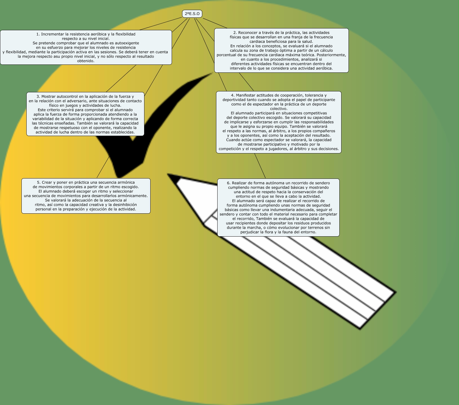 Este Cmap, tiene información relacionada con: criterios_2eso, 2ºE.S.O ???? 5. Crear y poner en práctica una secuencia armónica de movimientos corporales a partir de un ritmo escogido. El alumnado deberá escoger un ritmo y seleccionar una secuencia de movimientos para desarrollarlos armónicamente. Se valorará la adecuación de la secuencia al ritmo, así como la capacidad creativa y la desinhibición personal en la preparación y ejecución de la actividad., 2ºE.S.O ???? 6. Realizar de forma autónoma un recorrido de sendero cumpliendo normas de seguridad básicas y mostrando una actitud de respeto hacia la conservación del entorno en el que se lleva a cabo la actividad. El alumnado será capaz de realizar el recorrido de forma autónoma cumpliendo unas normas de seguridad básicas como llevar una indumentaria adecuada, seguir el sendero y contar con todo el material necesario para completar el recorrido, También se evaluará la capacidad de usar recipientes donde depositar los residuos producidos durante la marcha, o cómo evolucionar por terrenos sin perjudicar la flora y la fauna del entorno., 2ºE.S.O ???? 3. Mostrar autocontrol en la aplicación de la fuerza y en la relación con el adversario, ante situaciones de contacto físico en juegos y actividades de lucha. Este criterio servirá para comprobar si el alumnado aplica la fuerza de forma proporcionada atendiendo a la variabilidad de la situación y aplicando de forma correcta las técnicas enseñadas. También se valorará la capacidad de mostrarse respetuoso con el oponente, realizando la actividad de lucha dentro de las normas establecidas., 2ºE.S.O ???? 2. Reconocer a través de la práctica, las actividades físicas que se desarrollan en una franja de la frecuencia cardiaca beneficiosa para la salud. En relación a los conceptos, se evaluará si el alumnado calcula su zona de trabajo óptima a partir de un cálculo porcentual de su frecuencia cardiaca máxima teórica. Posteriormente, en cuanto a los procedimientos, analizará si diferentes actividades físicas se encuentran dentro del intervalo de lo que se considera una actividad aeróbica., 2ºE.S.O ???? 4. Manifestar actitudes de cooperación, tolerancia y deportividad tanto cuando se adopta el papel de participante como el de espectador en la práctica de un deporte colectivo. El alumnado participará en situaciones competitivas del deporte colectivo escogido. Se valorará su capacidad de implicarse y esforzarse en cumplir las responsabilidades que le asigna su propio equipo. También se valorará el respeto a las normas, al árbitro, a los propios compañeros y a los oponentes, así como la aceptación del resultado. Cuando actúe como espectador se valorará, la capacidad de mostrarse participativo y motivado por la competición y el respeto a jugadores, al árbitro y sus decisiones., 2ºE.S.O ???? 1. Incrementar la resistencia aeróbica y la flexibilidad respecto a su nivel inicial. Se pretende comprobar que el alumnado es autoexigente en su esfuerzo para mejorar los niveles de resistencia y flexibilidad, mediante la participación activa en las sesiones. Se deberá tener en cuenta la mejora respecto asu propio nivel inicial, y no sólo respecto al resultado obtenido.