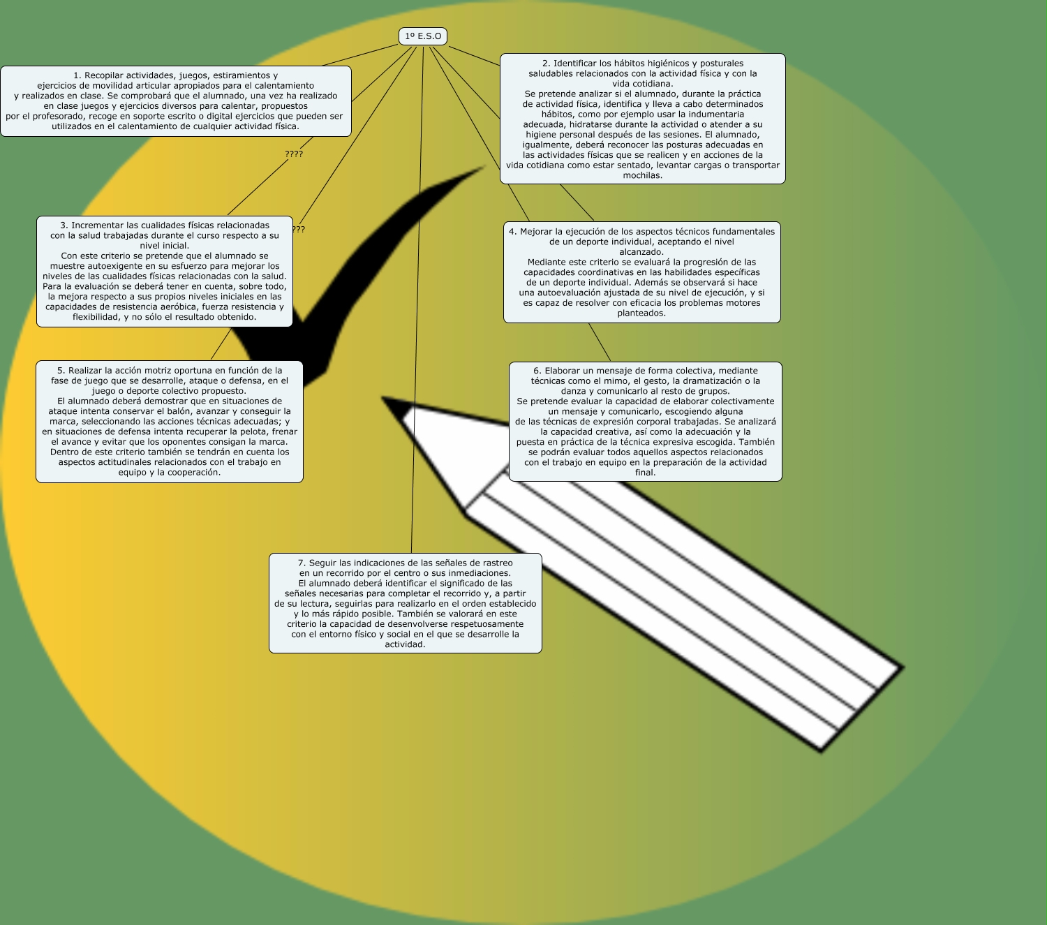 Este Cmap, tiene información relacionada con: criterios_1eso, 1º E.S.O ???? 7. Seguir las indicaciones de las señales de rastreo en un recorrido por el centro o sus inmediaciones. El alumnado deberá identificar el significado de las señales necesarias para completar el recorrido y, a partir de su lectura, seguirlas para realizarlo en el orden establecido y lo más rápido posible. También se valorará en este criterio la capacidad de desenvolverse respetuosamente con el entorno físico y social en el que se desarrolle la actividad., 1º E.S.O ???? 1. Recopilar actividades, juegos, estiramientos y ejercicios de movilidad articular apropiados para el calentamiento y realizados en clase. Se comprobará que el alumnado, una vez ha realizado en clase juegos y ejercicios diversos para calentar, propuestos por el profesorado, recoge en soporte escrito o digital ejercicios que pueden ser utilizados en el calentamiento de cualquier actividad física., 1º E.S.O ???? 4. Mejorar la ejecución de los aspectos técnicos fundamentales de un deporte individual, aceptando el nivel alcanzado. Mediante este criterio se evaluará la progresión de las capacidades coordinativas en las habilidades específicas de un deporte individual. Además se observará si hace una autoevaluación ajustada de su nivel de ejecución, y si es capaz de resolver con eficacia los problemas motores planteados., 1º E.S.O ???? 3. Incrementar las cualidades físicas relacionadas con la salud trabajadas durante el curso respecto a su nivel inicial. Con este criterio se pretende que el alumnado se muestre autoexigente en su esfuerzo para mejorar los niveles de las cualidades físicas relacionadas con la salud. Para la evaluación se deberá tener en cuenta, sobre todo, la mejora respecto a sus propios niveles iniciales en las capacidades de resistencia aeróbica, fuerza resistencia y flexibilidad, y no sólo el resultado obtenido., 1º E.S.O ???? 2. Identificar los hábitos higiénicos y posturales saludables relacionados con la actividad física y con la vida cotidiana. Se pretende analizar si el alumnado, durante la práctica de actividad física, identifica y lleva a cabo determinados hábitos, como por ejemplo usar la indumentaria adecuada, hidratarse durante la actividad o atender a su higiene personal después de las sesiones. El alumnado, igualmente, deberá reconocer las posturas adecuadas en las actividades físicas que se realicen y en acciones de la vida cotidiana como estar sentado, levantar cargas o transportar mochilas., 1º E.S.O ???? 5. Realizar la acción motriz oportuna en función de la fase de juego que se desarrolle, ataque o defensa, en el juego o deporte colectivo propuesto. El alumnado deberá demostrar que en situaciones de ataque intenta conservar el balón, avanzar y conseguir la marca, seleccionando las acciones técnicas adecuadas; y en situaciones de defensa intenta recuperar la pelota, frenar el avance y evitar que los oponentes consigan la marca. Dentro de este criterio también se tendrán en cuenta los aspectos actitudinales relacionados con el trabajo en equipo y la cooperación., 1º E.S.O ???? 6. Elaborar un mensaje de forma colectiva, mediante técnicas como el mimo, el gesto, la dramatización o la danza y comunicarlo al resto de grupos. Se pretende evaluar la capacidad de elaborar colectivamente un mensaje y comunicarlo, escogiendo alguna de las técnicas de expresión corporal trabajadas. Se analizará la capacidad creativa, así como la adecuación y la puesta en práctica de la técnica expresiva escogida. También se podrán evaluar todos aquellos aspectos relacionados con el trabajo en equipo en la preparación de la actividad final.