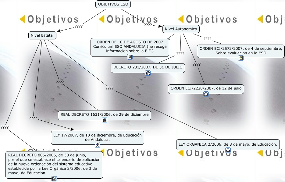 Este Cmap, tiene información relacionada con: mapa conceptual, Nivel Estatal ???? LEY 17/2007, de 10 de diciembre, de Educación de Andalucía., OBJETIVOS ESO ???? Nivel Autonomico, Nivel Estatal ???? REAL DECRETO 806/2006, de 30 de junio, por el que se establece el calendario de aplicación de la nueva ordenación del sistema educativo, establecida por la Ley Orgánica 2/2006, de 3 de mayo, de Educación., Nivel Autonomico ???? ORDEN ECI/2572/2007, de 4 de septiembre, Sobre evaluacion en la ESO, Nivel Autonomico ???? ORDEN ECI/2220/2007, de 12 de julio, Nivel Autonomico ???? ORDEN DE 10 DE AGOSTO DE 2007 Curriculum ESO ANDALUCIA (no recoge informacion sobre la E.F.), OBJETIVOS ESO ???? Nivel Estatal, Nivel Estatal ???? REAL DECRETO 1631/2006, de 29 de diciembre, Nivel Estatal ???? LEY ORGÁNICA 2/2006, de 3 de mayo, de Educación., Nivel Autonomico ???? DECRETO 231/2007, DE 31 DE JULIO