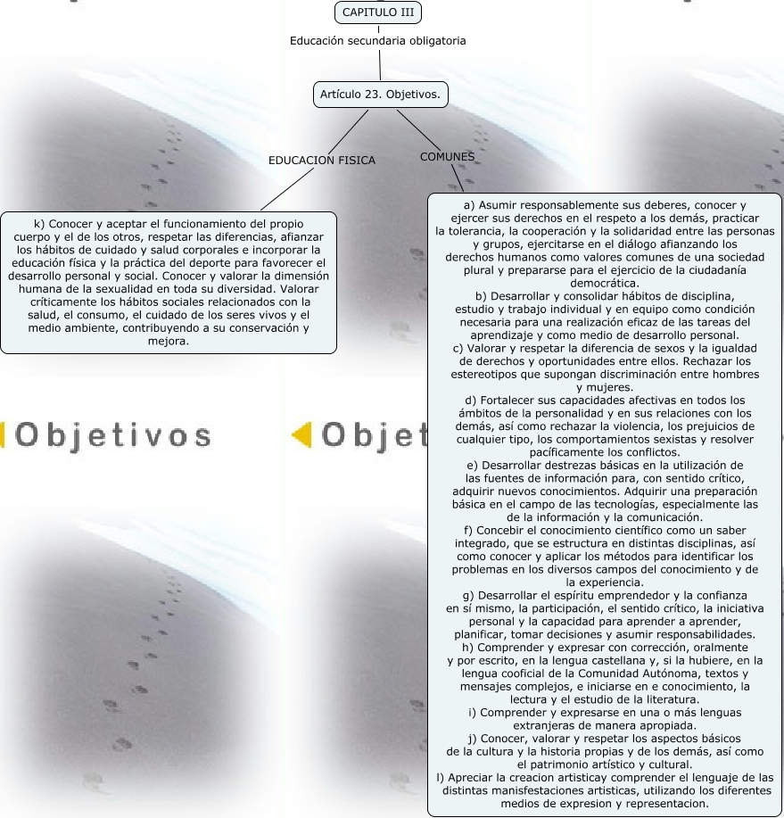 Este Cmap, tiene información relacionada con: MAPA LOE, Artículo 23. Objetivos. EDUCACION FISICA k) Conocer y aceptar el funcionamiento del propio cuerpo y el de los otros, respetar las diferencias, afianzar los hábitos de cuidado y salud corporales e incorporar la educación física y la práctica del deporte para favorecer el desarrollo personal y social. Conocer y valorar la dimensión humana de la sexualidad en toda su diversidad. Valorar críticamente los hábitos sociales relacionados con la salud, el consumo, el cuidado de los seres vivos y el medio ambiente, contribuyendo a su conservación y mejora., CAPITULO III Educación secundaria obligatoria Artículo 23. Objetivos., Artículo 23. Objetivos. COMUNES a) Asumir responsablemente sus deberes, conocer y ejercer sus derechos en el respeto a los demás, practicar la tolerancia, la cooperación y la solidaridad entre las personas y grupos, ejercitarse en el diálogo afianzando los derechos humanos como valores comunes de una sociedad plural y prepararse para el ejercicio de la ciudadanía democrática. b) Desarrollar y consolidar hábitos de disciplina, estudio y trabajo individual y en equipo como condición necesaria para una realización eficaz de las tareas del aprendizaje y como medio de desarrollo personal. c) Valorar y respetar la diferencia de sexos y la igualdad de derechos y oportunidades entre ellos. Rechazar los estereotipos que supongan discriminación entre hombres y mujeres. d) Fortalecer sus capacidades afectivas en todos los ámbitos de la personalidad y en sus relaciones con los demás, así como rechazar la violencia, los prejuicios de cualquier tipo, los comportamientos sexistas y resolver pacíficamente los conflictos. e) Desarrollar destrezas básicas en la utilización de las fuentes de información para, con sentido crítico, adquirir nuevos conocimientos. Adquirir una preparación básica en el campo de las tecnologías, especialmente las de la información y la comunicación. f) Concebir el conocimiento científico como un saber integrado, que se estructura en distintas disciplinas, así como conocer y aplicar los métodos para identificar los problemas en los diversos campos del conocimiento y de la experiencia. g) Desarrollar el espíritu emprendedor y la confianza en sí mismo, la participación, el sentido crítico, la iniciativa personal y la capacidad para aprender a aprender, planificar, tomar decisiones y asumir responsabilidades. h) Comprender y expresar con corrección, oralmente y por escrito, en la lengua castellana y, si la hubiere, en la lengua cooficial de la Comunidad Autónoma, textos y mensajes complejos, e iniciarse en e conocimiento, la lectura y el estudio de la literatura. i) Comprender y expresarse en una o más lenguas extranjeras de manera apropiada. j) Conocer, valorar y respetar los aspectos básicos de la cultura y la historia propias y de los demás, así como el patrimonio artístico y cultural. l) Apreciar la creacion artisticay comprender el lenguaje de las distintas manisfestaciones artisticas, utilizando los diferentes medios de expresion y representacion.
