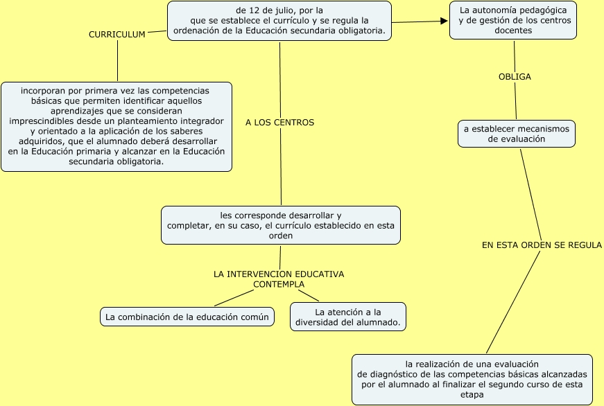 Este Cmap, tiene información relacionada con: MAPA PREAMBULO ECI_2220_2007, a establecer mecanismos de evaluación EN ESTA ORDEN SE REGULA la realización de una evaluación de diagnóstico de las competencias básicas alcanzadas por el alumnado al finalizar el segundo curso de esta etapa, La autonomía pedagógica y de gestión de los centros docentes OBLIGA a establecer mecanismos de evaluación, de 12 de julio, por la que se establece el currículo y se regula la ordenación de la Educación secundaria obligatoria. A LOS CENTROS les corresponde desarrollar y completar, en su caso, el currículo establecido en esta orden, les corresponde desarrollar y completar, en su caso, el currículo establecido en esta orden LA INTERVENCION EDUCATIVA CONTEMPLA La atención a la diversidad del alumnado., de 12 de julio, por la que se establece el currículo y se regula la ordenación de la Educación secundaria obligatoria. CURRICULUM incorporan por primera vez las competencias básicas que permiten identificar aquellos aprendizajes que se consideran imprescindibles desde un planteamiento integrador y orientado a la aplicación de los saberes adquiridos, que el alumnado deberá desarrollar en la Educación primaria y alcanzar en la Educación secundaria obligatoria., les corresponde desarrollar y completar, en su caso, el currículo establecido en esta orden LA INTERVENCION EDUCATIVA CONTEMPLA La combinación de la educación común, de 12 de julio, por la que se establece el currículo y se regula la ordenación de la Educación secundaria obligatoria. ???? La autonomía pedagógica y de gestión de los centros docentes