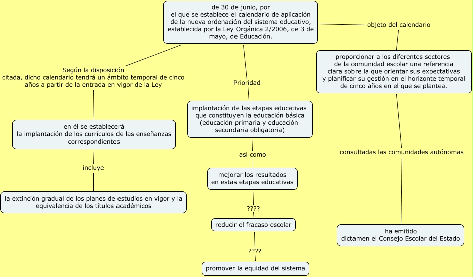 Este Cmap, tiene información relacionada con: mapa preambulo RD 806_2006, reducir el fracaso escolar ???? promover la equidad del sistema, en él se establecerá la implantación de los currículos de las enseñanzas correspondientes incluye la extinción gradual de los planes de estudios en vigor y la equivalencia de los títulos académicos, mejorar los resultados en estas etapas educativas ???? reducir el fracaso escolar, de 30 de junio, por el que se establece el calendario de aplicación de la nueva ordenación del sistema educativo, establecida por la Ley Orgánica 2/2006, de 3 de mayo, de Educación. Prioridad implantación de las etapas educativas que constituyen la educación básica (educación primaria y educación secundaria obligatoria), implantación de las etapas educativas que constituyen la educación básica (educación primaria y educación secundaria obligatoria) asi como mejorar los resultados en estas etapas educativas, proporcionar a los diferentes sectores de la comunidad escolar una referencia clara sobre la que orientar sus expectativas y planificar su gestión en el horizonte temporal de cinco años en el que se plantea. consultadas las comunidades autónomas ha emitido dictamen el Consejo Escolar del Estado, de 30 de junio, por el que se establece el calendario de aplicación de la nueva ordenación del sistema educativo, establecida por la Ley Orgánica 2/2006, de 3 de mayo, de Educación. objeto del calendario proporcionar a los diferentes sectores de la comunidad escolar una referencia clara sobre la que orientar sus expectativas y planificar su gestión en el horizonte temporal de cinco años en el que se plantea., de 30 de junio, por el que se establece el calendario de aplicación de la nueva ordenación del sistema educativo, establecida por la Ley Orgánica 2/2006, de 3 de mayo, de Educación. Según la disposición citada, dicho calendario tendrá un ámbito temporal de cinco años a partir de la entrada en vigor de la Ley en él se establecerá la implantación de los currículos de las enseñanzas correspondientes