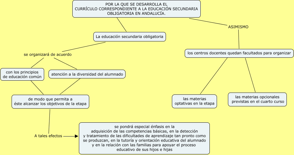 Este Cmap, tiene información relacionada con: MAPA PREAMBULO ORDEN 10 DE AGOSTO 2007, POR LA QUE SE DESARROLLA EL CURRÍCULO CORRESPONDIENTE A LA EDUCACIÓN SECUNDARIA OBLIGATORIA EN ANDALUCÍA. ASIMISMO los centros docentes quedan facultados para organizar, los centros docentes quedan facultados para organizar ???? las materias opcionales previstas en el cuarto curso, atención a la diversidad del alumnado ???? de modo que permita a éste alcanzar los objetivos de la etapa, los centros docentes quedan facultados para organizar ???? las materias optativas en la etapa, La educación secundaria obligatoria se organizará de acuerdo con los principios de educación común, de modo que permita a éste alcanzar los objetivos de la etapa A tales efectos se pondrá especial énfasis en la adquisición de las competencias básicas, en la detección y tratamiento de las dificultades de aprendizaje tan pronto como se produzcan, en la tutoría y orientación educativa del alumnado y en la relación con las familias para apoyar el proceso educativo de sus hijos e hijas, La educación secundaria obligatoria se organizará de acuerdo atención a la diversidad del alumnado, con los principios de educación común ???? de modo que permita a éste alcanzar los objetivos de la etapa, POR LA QUE SE DESARROLLA EL CURRÍCULO CORRESPONDIENTE A LA EDUCACIÓN SECUNDARIA OBLIGATORIA EN ANDALUCÍA. ???? La educación secundaria obligatoria