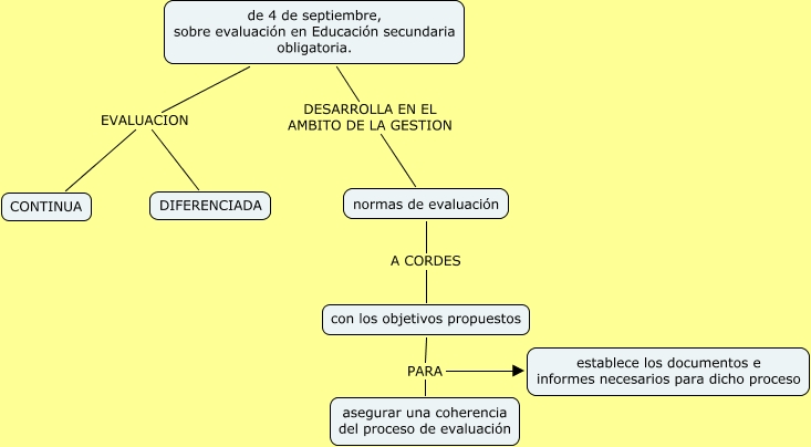 Este Cmap, tiene información relacionada con: MAPA PREAMBULO ECI_2572_2007, normas de evaluación A CORDES con los objetivos propuestos, de 4 de septiembre, sobre evaluación en Educación secundaria obligatoria. EVALUACION CONTINUA, con los objetivos propuestos PARA establece los documentos e informes necesarios para dicho proceso, con los objetivos propuestos PARA asegurar una coherencia del proceso de evaluación, de 4 de septiembre, sobre evaluación en Educación secundaria obligatoria. EVALUACION DIFERENCIADA, de 4 de septiembre, sobre evaluación en Educación secundaria obligatoria. DESARROLLA EN EL AMBITO DE LA GESTION normas de evaluación