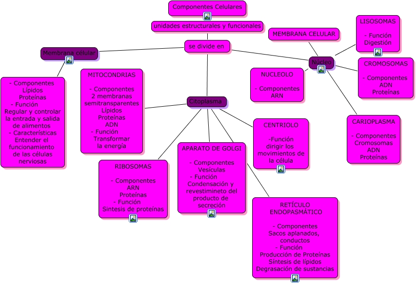 Este Cmap, tiene información relacionada con: TIC, MITOCONDRIAS - Componentes 2 membranas semitransparentes Lípidos Proteínas ADN - Función Transformar la energía Citoplasma APARATO DE GOLGI - Componentes Vesículas - Función Condensación y revestimineto del producto de secreción, MITOCONDRIAS - Componentes 2 membranas semitransparentes Lípidos Proteínas ADN - Función Transformar la energía Citoplasma RETÍCULO ENDOPASMÁTICO - Componentes Sacos aplanados, conductos - Función Producción de Proteínas Síntesis de lípidos Degrasación de sustancias, LISOSOMAS - Función Digestión Núcleo CARIOPLASMA - Componentes Cromosomas ADN Proteínas, se divide en Citoplasma APARATO DE GOLGI - Componentes Vesículas - Función Condensación y revestimineto del producto de secreción, Componentes Celulares unidades estructurales y funcionales se divide en, se divide en Núcleo CARIOPLASMA - Componentes Cromosomas ADN Proteínas, se divide en Citoplasma RIBOSOMAS - Componentes ARN Proteínas - Función Sintesis de proteínas, se divide en Citoplasma CENTRIOLO -Función dirigir los movimientos de la célula, MITOCONDRIAS - Componentes 2 membranas semitransparentes Lípidos Proteínas ADN - Función Transformar la energía Citoplasma RIBOSOMAS - Componentes ARN Proteínas - Función Sintesis de proteínas, se divide en Citoplasma RETÍCULO ENDOPASMÁTICO - Componentes Sacos aplanados, conductos - Función Producción de Proteínas Síntesis de lípidos Degrasación de sustancias, se divide en Membrana célular - Componentes Lípidos Proteínas - Función Regular y controlar la entrada y salida de alimentos - Características Entender el funcionamiento de las células nerviosas, CROMOSOMAS - Componentes ADN Proteínas Núcleo CARIOPLASMA - Componentes Cromosomas ADN Proteínas, MEMBRANA CELULAR Núcleo CARIOPLASMA - Componentes Cromosomas ADN Proteínas, MITOCONDRIAS - Componentes 2 membranas semitransparentes Lípidos Proteínas ADN - Función Transformar la energía Citoplasma CENTRIOLO -Función dirigir los movimientos de la célula, NUCLEOLO - Componentes ARN Núcleo CARIOPLASMA - Componentes Cromosomas ADN Proteínas