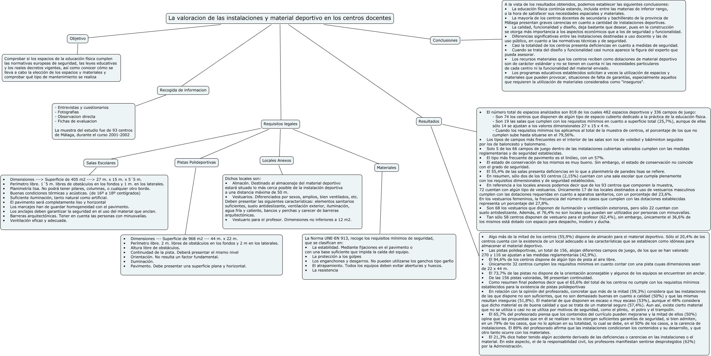 Este Cmap, tiene información relacionada con: esquema articulo, Requisitos legales ???? Materiales, Objetivo ???? Comprobar si los espacios de la educación física cumplen las normativas europeas de seguridad, las leyes educativas y los reales decretos vigentes, así como conocer cómo se lleva a cabo la elección de los espacios y materiales y comprobar qué tipo de mantenimiento se realiza, Locales Anexos ???? Dichos locales son: • Almacén. Destinado al almacenaje del material deportivo estará situado lo más cerca posible de la instalación deportiva a una distancia máxima de 50 m. • Vestuarios. Diferenciados por sexos, amplios, bien ventilados, etc. Deben presentar las siguientes características: elementos sanitarios suficientes, suelo antideslizante, ventilación exterior, iluminación, agua fría y caliente, bancos y perchas y carecer de barreras arquitectónicas. • Vestuario para el profesor. Dimensiones no inferiores a 12 m2., Pistas Polideportivas ???? • Dimensiones --- Superficie de 968 m2 --- 44 m. x 22 m. • Perímetro libre. 2 m. libres de obstáculos en los fondos y 2 m en los laterales. • Altura libre de obstáculos. • Continuidad de la pista. Deberá presentar el mismo nivel • Orientación. No resulta un factor fundamental. • Iluminación. • Pavimento. Debe presentar una superficie plana y horizontal., Salas Escolares ???? • Dimensiones ---> Superficie de 405 m2 ---> 27 m. x 15 m. x 5´5 m. • Perímetro libre. 1´5 m. libres de obstáculos en los fondos y 1 m. en los laterales. • Planimetría lisa. No podrá tener pilares, columnas, o cualquier otro borde. • Buenas condiciones térmicas y acústicas. (de 16º a 18º centígrados) • Suficiente iluminación, tanto natural como artificial. • El pavimento será completamente liso y horizontal • Los marcajes han de guardar homogeneidad con el pavimento. • Los anclajes deben garantizar la seguridad en el uso del material que anclan. • Barreras arquitectónicas. Tener en cuenta las personas con minusvalías. • Ventilación eficaz y adecuada., La valoracion de las instalaciones y material deportivo en los centros docentes ???? Recogida de informacion, Resultados ???? • El número total de espacios analizados son 818 de los cuales 482 espacios deportivos y 336 campos de juego: - Son 74 los centros que disponen de algún tipo de espacio cubierto dedicado a la práctica de la educación física. - Son 19 las salas que cumplen con los requisitos mínimos en cuanto a superficie total (25,7%), aunque de ellas sólo 14 se ajustan a los valores dimensionales 27 x 15 x 4 m. - Cuando los requisitos mínimos los aplicamos al total de la muestra de centros, el porcentaje de los que no cumplen sube hasta situarse en el 79,56%. • Los tipos de campos más frecuentes en el interior de las salas son los de voleibol y bádminton seguidos por los de baloncesto y balonmano. • Solo 5 de los 66 campos de juego dentro de las instalaciones cubiertas valorados cumplen con las medidas reglamentarias y de seguridad establecidas. • El tipo más frecuente de pavimento es el linóleo, con un 57%. • El estado de conservación de los mismos es muy bueno. Sin embargo, el estado de conservación no coincide con el grado de seguridad. • El 55,4% de las salas presenta deficiencias en lo que a planimetría de paredes lisas se refiere. • En resumen, sólo dos de los 93 centros (2,15%) cuentan con una sala escolar que cumpla plenamente con los requisitos dimensionales y de seguridad establecidos. • En referencia a los locales anexos podemos decir que de los 93 centros que componen la muestra, 72 cuentan con algún tipo de vestuarios. Únicamente 17 de los locales destinados a uso de vestuarios masculinos cumplen con las dotaciones requeridas en cuanto a aparatos sanitarios, con un porcentaje del 23,6%. En los vestuarios femeninos, la frecuencia del número de casos que cumplen con las dotaciones establecidas representa un porcentaje del 27,8%. • Son 68 los vestuarios que disponen de iluminación y ventilación exteriores, pero sólo 22 cuentan con suelo antideslizante. Además, el 76,4% no son locales que puedan ser utilizados por personas con minusvalías. • Tan sólo 58 centros disponen de vestuario para el profesor (62,4%), sin embargo, únicamente el 36,6% de los mismos está dotado con espacio para despacho, inodoro y ducha., La valoracion de las instalaciones y material deportivo en los centros docentes ???? Objetivo, La valoracion de las instalaciones y material deportivo en los centros docentes ???? - Entrevistas y cuestionarios - Fotografias - Observacion directa - Fichas de evaluacion La muestra del estudio fue de 93 centros de Málaga, durante el curso 2001-2002, Requisitos legales ???? Salas Escolares, Requisitos legales ???? Pistas Polideportivas, Locales Anexos ???? Dichos locales son: • Almacén. Destinado al almacenaje del material deportivo estará situado lo más cerca posible de la instalación deportiva a una distancia máxima de 50 m. • Vestuarios. Diferenciados por sexos, amplios, bien ventilados, etc. Deben presentar las siguientes características: elementos sanitarios suficientes, suelo antideslizante, ventilación exterior, iluminación, agua fría y caliente, bancos y perchas y carecer de barreras arquitectónicas. • Vestuario para el profesor. Dimensiones no inferiores a 12 m2., La valoracion de las instalaciones y material deportivo en los centros docentes ???? Resultados, Requisitos legales ???? Locales Anexos, Conclusiones ???? A la vista de los resultados obtenidos, podemos establecer las siguientes conclusiones: • La educación física continúa estando, incluida entre las materias de inferior rango, a la hora de satisfacer sus necesidades espaciales y materiales. • La mayoría de los centros docentes de secundaria y bachillerato de la provincia de Málaga presentan graves carencias en cuanto a cantidad de instalaciones deportivas. • La calidad, funcionalidad 