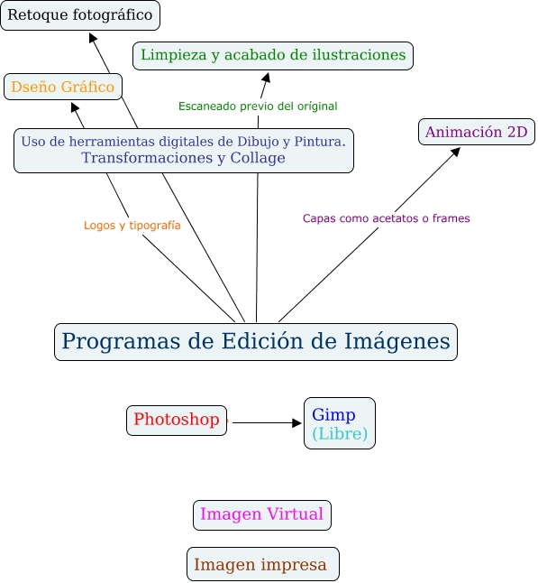Este Cmap, tiene información relacionada con: Programas de edición de Imágenes, Photoshop ???? Gimp (Libre), Programas de Edición de Imágenes Escaneado previo del oríginal Limpieza y acabado de ilustraciones, Programas de Edición de Imágenes Retoque fotográfico, Programas de Edición de Imágenes Capas como acetatos o frames Animación 2D, Programas de Edición de Imágenes Logos y tipografía Dseño Gráfico