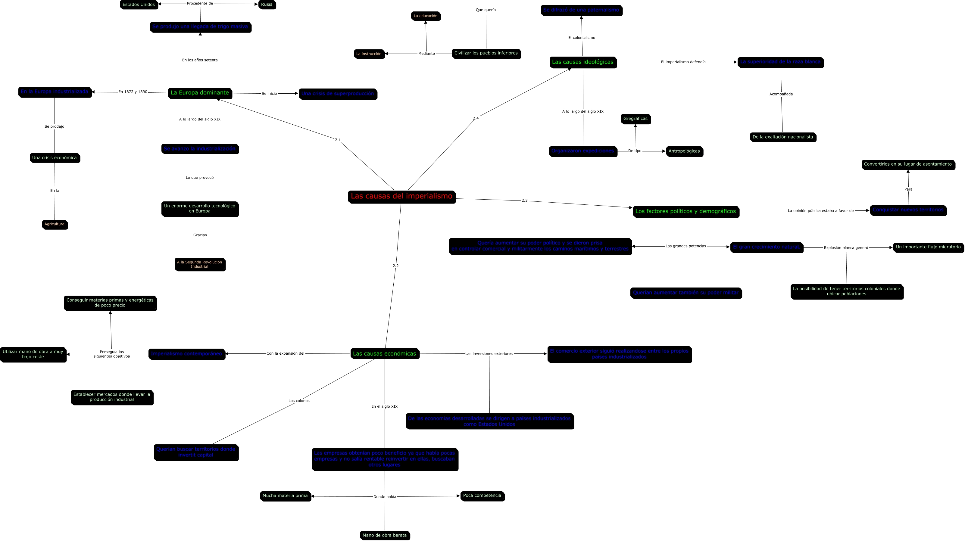 Este Cmap, tiene información relacionada con: tema 5 punto 2, El gran crecimiento naturaL Explosión blanca generó Un importante flujo migratorio, Un enorme desarrollo tecnológico en Europa Gracias A la Segunda Revolución Industrial, Imperialismo contemporáneo Perseguía los siguientes objetivoa Establecer mercados donde llevar la producción industrial, Las causas del imperialismo 2.4 Las causas ideológicas, Se avanzo la industrialización Lo que provocó Un enorme desarrollo tecnológico en Europa, Los factores políticos y demográficos La opinión pública estaba a favor de Conquistar nuevos territorios, Organizaron expediciones De tipo Antropológicas, Los factores políticos y demográficos Las grandes potencias Quería aumentar su poder político y se dieron prisa en controlar comercial y militarmente los caminos marítimos y terrestres, Los factores políticos y demográficos Las grandes potencias El gran crecimiento naturaL, La superioridad de la raza blanca Acompañada De la exaltación nacionalista, Imperialismo contemporáneo Perseguía los siguientes objetivoa Conseguir materias primas y energéticas de poco precio, Las causas del imperialismo 2.1 La Europa dominante, Las causas económicas Las inversiones exteriores De las economias desarrolladas se dirigen a países industrializados como Estados Unidos, En la Europa industrializada Se prodejo Una crisis económica, El gran crecimiento naturaL Explosión blanca generó La posibilidad de tener territorios coloniales donde ubicar poblaciones, Imperialismo contemporáneo Perseguía los siguientes objetivoa Utilizar mano de obra a muy bajo coste, Organizaron expediciones De tipo Gregráficas, Las empresas obtenían poco beneficio ya que había pocas empresas y no salía rentable reinvertir en ellas, buscaban otros lugares Donde había Poca competencia, Se produjo una llegada de trigo masiva Procedente de Estados Unidos, Las causas económicas En el siglo XIX Las empresas obtenían poco beneficio ya que había pocas empresas y no salía rentable reinvertir en ellas, buscaban otros lugares