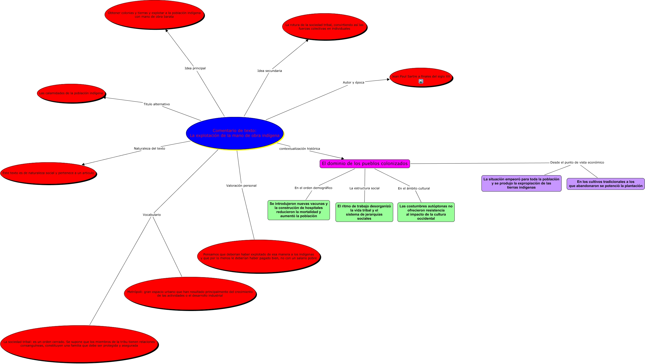 Este Cmap, tiene información relacionada con: Comentario 2, Comentario de texto: La explotación de la mano de obra indígena Vocabulario Metrópoli: gran espacio urbano que han resultado principalmente del crecimiento de las actividades o el desarrollo industrial, Comentario de texto: La explotación de la mano de obra indígena contextualización histórica El dominio de los pueblos colonizados, El dominio de los pueblos colonizados En el ámbito cultural Las costumbres autóptonas no ofrecieron resistencia al impacto de la cultura occidental, El dominio de los pueblos colonizados Desde el punto de vista económico En los cultivos tradicionales a los que abandonaron se potenció la plantación, Comentario de texto: La explotación de la mano de obra indígena Idea principal Obtener colonias y tierras y explotar a la población indígena con mano de obra barata, Comentario de texto: La explotación de la mano de obra indígena Idea secundaria La rotura de la sociedad tribal, convirtiendo así las fuerzas colectivas en individuales, Comentario de texto: La explotación de la mano de obra indígena Titulo alternativo Las calamidades de la población indígena, El dominio de los pueblos colonizados Desde el punto de vista económico La situación empeoró para toda la población y se produjo la expropiación de las tierras indígenas, Comentario de texto: La explotación de la mano de obra indígena Vocabulario La sociedad tribal: es un orden cerrado. Se supone que los miembros de la tribu tienen relaciones consanguíneas, constituyen una familia que debe ser protegida y asegurada, Comentario de texto: La explotación de la mano de obra indígena Autor y época Jean Paul Sartre a finales del siglo XX, El dominio de los pueblos colonizados En el orden demográfico Se introdujeron nuevas vacunas y la construción de hospitales reducieron la mortalidad y aumentó la población, Comentario de texto: La explotación de la mano de obra indígena Naturaleza del texto Este texto es de naturaleza social y pertenece a un articulo, El dominio de los pueblos colonizados La estructura social El ritmo de trabajo desorganizó la vida tribal y el sistema de jerarquías sociales, Comentario de texto: La explotación de la mano de obra indígena Valoración personal Pensamos que deberian haber explotado de esa manera a los indígenas y que por lo menos le deberían haber pagado bien, no con un salario pobre
