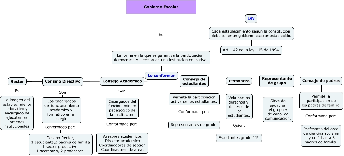 Este Cmap, tiene información relacionada con: Trabajo Ana Maria Zapata, Encargados del funcionamiento pedagogico de la institucion. Conformado por: Asesores academicos Director academico Coordinadores de seccion Coordinadores de area., Consejo Academico Son Encargados del funcionamiento pedagogico de la institucion., Consejo Directivo Son Los encargados del funcionamiento academico y formativo en el colegio., Vela por los derechos y deberes de los estudiantes. Quien: Estudiantes grado 11°., La forma en la que se garantiza la participacion, democracia y eleccion en una institucion educativa. Lo conforman, Lo conforman Consejo de padres, Gobierno Escolar Es La forma en la que se garantiza la participacion, democracia y eleccion en una institucion educativa., Personero ???? Vela por los derechos y deberes de los estudiantes., Cada establecimiento segun la constitucion debe tener un gobierno escolar establecido. Art. 142 de la ley 115 de 1994., Gobierno Escolar Ley, Lo conforman Rector, Ley Cada establecimiento segun la constitucion debe tener un gobierno escolar establecido., Los encargados del funcionamiento academico y formativo en el colegio. Conformado por: Decano Rector, 1 estudiante,2 padres de familia 1 sector productivo, 1 secretario, 2 profesores., Consejo de estudiantes ???? Permite la participacion activa de los estudiantes., Rector Es La imagen del establecimiento educativo y encargado de ejecutar las ordenes institucionales., Permite la participacion activa de los estudiantes. Conformado por: Representantes de grado., Consejo de padres ° Permite la participacion de los padres de familia., Representante de grupo ???? Sirve de apoyo en el grupo y de canal de comunicacion., Permite la participacion de los padres de familia. Conformado por: Profesores del area de ciencias sociales y de 1 hasta 3 padres de familia.