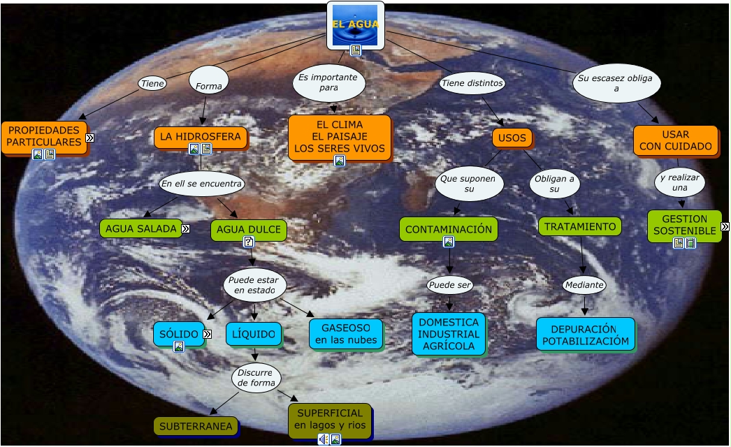 Este Cmap, tiene información relacionada con: el agua, LÍQUIDO Discurre de forma SUBTERRANEA, TRATAMIENTO Mediante DEPURACIÓN POTABILIZACIÓM, EL AGUA Forma LA HIDROSFERA, EL AGUA Tiene distintos USOS, AGUA DULCE Puede estar en estado LÍQUIDO, EL AGUA Tiene PROPIEDADES PARTICULARES, USOS Que suponen su CONTAMINACIÓN, LÍQUIDO Discurre de forma SUPERFICIAL en lagos y rios, EL AGUA Su escasez obliga a USAR CON CUIDADO, USOS Obligan a su TRATAMIENTO, EL AGUA Es importante para EL CLIMA EL PAISAJE LOS SERES VIVOS, LA HIDROSFERA En ell se encuentra AGUA SALADA, USAR CON CUIDADO y realizar una GESTION SOSTENIBLE, CONTAMINACIÓN Puede ser DOMESTICA INDUSTRIAL AGRÍCOLA, AGUA DULCE Puede estar en estado SÓLIDO, LA HIDROSFERA En ell se encuentra AGUA DULCE, AGUA DULCE Puede estar en estado GASEOSO en las nubes