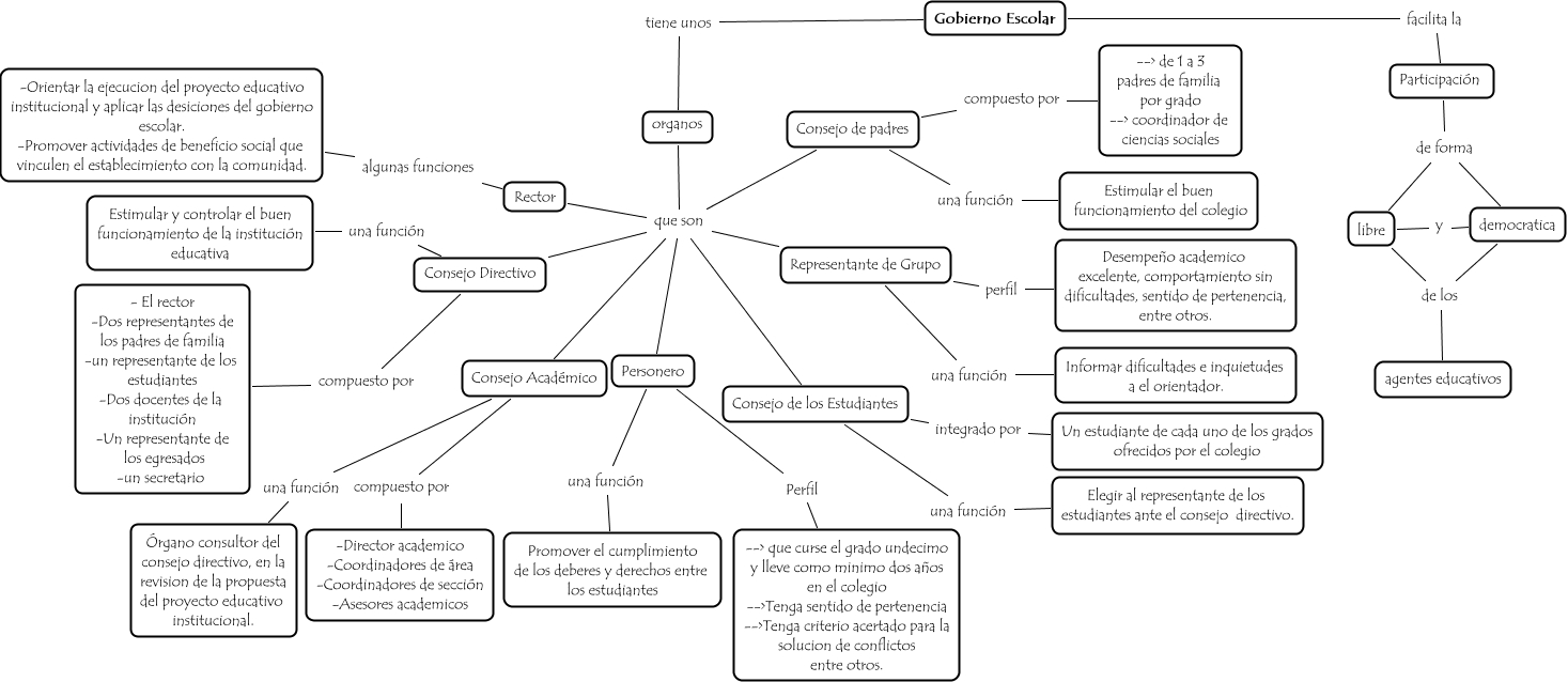 Este Cmap, tiene información relacionada con: gobierno escolar, organos que son Rector, Participación de forma libre, Rector algunas funciones -Orientar la ejecucion del proyecto educativo institucional y aplicar las desiciones del gobierno escolar. -Promover actividades de beneficio social que vinculen el establecimiento con la comunidad., Gobierno Escolar tiene unos organos, Consejo de los Estudiantes una función Elegir al representante de los estudiantes ante el consejo directivo., Personero una función Promover el cumplimiento de los deberes y derechos entre los estudiantes, Consejo Directivo compuesto por - El rector -Dos representantes de los padres de familia -un representante de los estudiantes -Dos docentes de la institución -Un representante de los egresados -un secretario, Consejo de padres compuesto por --> de 1 a 3 padres de familia por grado --> coordinador de ciencias sociales, organos que son Consejo Directivo, Consejo de los Estudiantes integrado por Un estudiante de cada uno de los grados ofrecidos por el colegio, organos que son Consejo de padres, libre de los agentes educativos, Gobierno Escolar facilita la Participación, Consejo de padres una función Estimular el buen funcionamiento del colegio, democratica de los agentes educativos, organos que son Consejo de los Estudiantes, Personero Perfil --> que curse el grado undecimo y lleve como minimo dos años en el colegio -->Tenga sentido de pertenencia -->Tenga criterio acertado para la solucion de conflictos entre otros., organos que son Consejo Académico, organos que son Personero, Representante de Grupo perfil Desempeño academico excelente, comportamiento sin dificultades, sentido de pertenencia, entre otros.