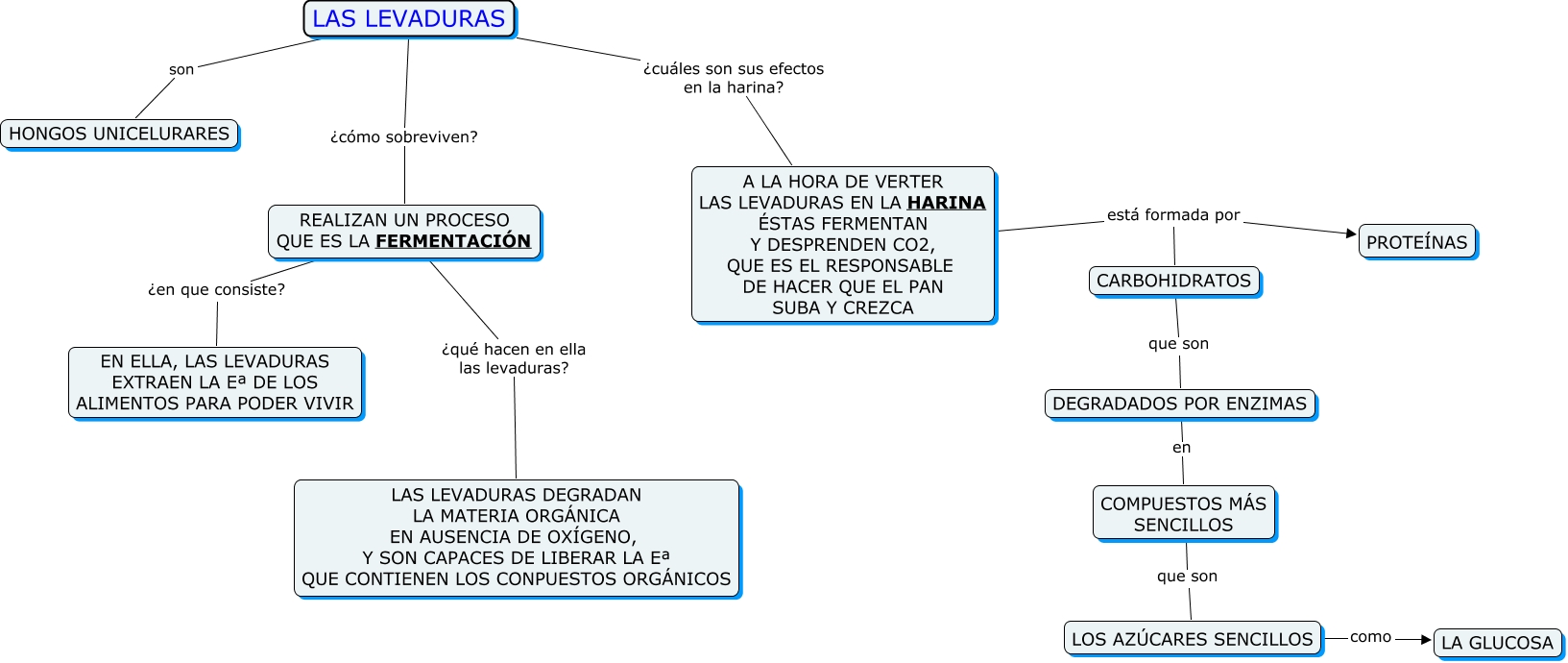 Este Cmap, tiene información relacionada con: Las levaduras, LAS LEVADURAS ¿cómo sobreviven? REALIZAN UN PROCESO QUE ES LA FERMENTACIÓN, DEGRADADOS POR ENZIMAS en COMPUESTOS MÁS SENCILLOS, A LA HORA DE VERTER LAS LEVADURAS EN LA HARINA ÉSTAS FERMENTAN Y DESPRENDEN CO2, QUE ES EL RESPONSABLE DE HACER QUE EL PAN SUBA Y CREZCA está formada por CARBOHIDRATOS, LAS LEVADURAS ¿cuáles son sus efectos en la harina? A LA HORA DE VERTER LAS LEVADURAS EN LA HARINA ÉSTAS FERMENTAN Y DESPRENDEN CO2, QUE ES EL RESPONSABLE DE HACER QUE EL PAN SUBA Y CREZCA, REALIZAN UN PROCESO QUE ES LA FERMENTACIÓN ¿qué hacen en ella las levaduras? LAS LEVADURAS DEGRADAN LA MATERIA ORGÁNICA EN AUSENCIA DE OXÍGENO, Y SON CAPACES DE LIBERAR LA Eª QUE CONTIENEN LOS CONPUESTOS ORGÁNICOS, REALIZAN UN PROCESO QUE ES LA FERMENTACIÓN ¿en que consiste? EN ELLA, LAS LEVADURAS EXTRAEN LA Eª DE LOS ALIMENTOS PARA PODER VIVIR, COMPUESTOS MÁS SENCILLOS que son LOS AZÚCARES SENCILLOS, LAS LEVADURAS son HONGOS UNICELURARES, CARBOHIDRATOS que son DEGRADADOS POR ENZIMAS, A LA HORA DE VERTER LAS LEVADURAS EN LA HARINA ÉSTAS FERMENTAN Y DESPRENDEN CO2, QUE ES EL RESPONSABLE DE HACER QUE EL PAN SUBA Y CREZCA está formada por PROTEÍNAS, LOS AZÚCARES SENCILLOS como LA GLUCOSA