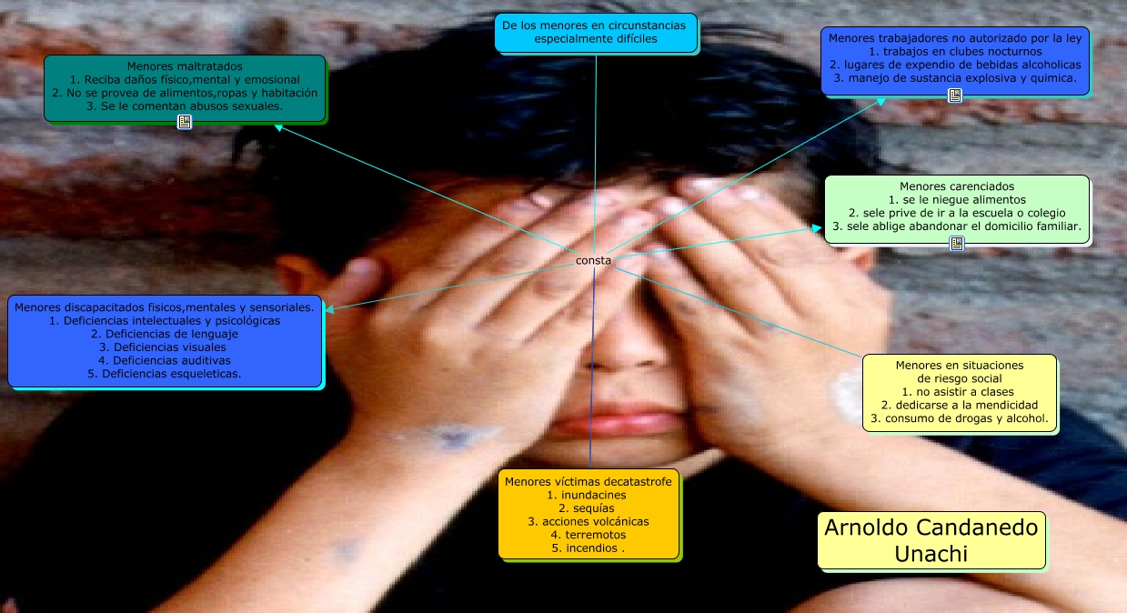 Este Cmap, tiene información relacionada con: ArnoldoC, De los menores en circunstancias especialmente difíciles consta Menores en situaciones de riesgo social 1. no asistir a clases 2. dedicarse a la mendicidad 3. consumo de drogas y alcohol., De los menores en circunstancias especialmente difíciles consta Menores víctimas decatastrofe 1. inundacines 2. sequías 3. acciones volcánicas 4. terremotos 5. incendios ., De los menores en circunstancias especialmente difíciles consta Menores maltratados 1. Reciba daños físico,mental y emosional 2. No se provea de alimentos,ropas y habitación 3. Se le comentan abusos sexuales., De los menores en circunstancias especialmente difíciles consta Menores carenciados 1. se le niegue alimentos 2. sele prive de ir a la escuela o colegio 3. sele ablige abandonar el domicilio familiar., De los menores en circunstancias especialmente difíciles consta Menores discapacitados fisicos,mentales y sensoriales. 1. Deficiencias intelectuales y psicológicas 2. Deficiencias de lenguaje 3. Deficiencias visuales 4. Deficiencias auditivas 5. Deficiencias esqueleticas., De los menores en circunstancias especialmente difíciles consta Menores trabajadores no autorizado por la ley 1. trabajos en clubes nocturnos 2. lugares de expendio de bebidas alcoholicas 3. manejo de sustancia explosiva y quimica., De los menores en circunstancias especialmente difíciles consta Menores víctimas decatastrofe 1. inundacines 2. sequías 3. acciones volcánicas 4. terremotos 5. incendios .