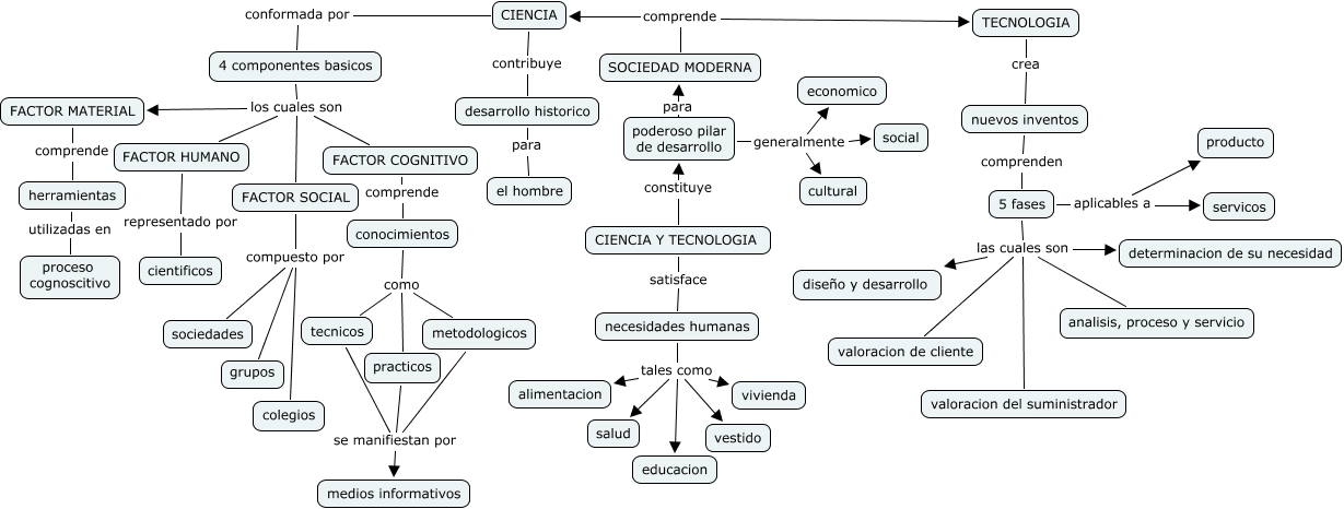 Este Cmap, tiene información relacionada con: ANDREA MORALES, poderoso pilar de desarrollo para SOCIEDAD MODERNA, 5 fases aplicables a servicos, poderoso pilar de desarrollo generalmente social, 5 fases las cuales son determinacion de su necesidad, nuevos inventos comprenden 5 fases, 4 componentes basicos los cuales son FACTOR MATERIAL, conocimientos como practicos, necesidades humanas tales como alimentacion, CIENCIA contribuye desarrollo historico, necesidades humanas tales como educacion, FACTOR SOCIAL compuesto por colegios, desarrollo historico para el hombre, necesidades humanas tales como salud, 4 componentes basicos los cuales son FACTOR HUMANO, FACTOR SOCIAL compuesto por sociedades, 5 fases aplicables a producto, poderoso pilar de desarrollo generalmente economico, tecnicos se manifiestan por medios informativos, FACTOR SOCIAL compuesto por grupos, TECNOLOGIA crea nuevos inventos