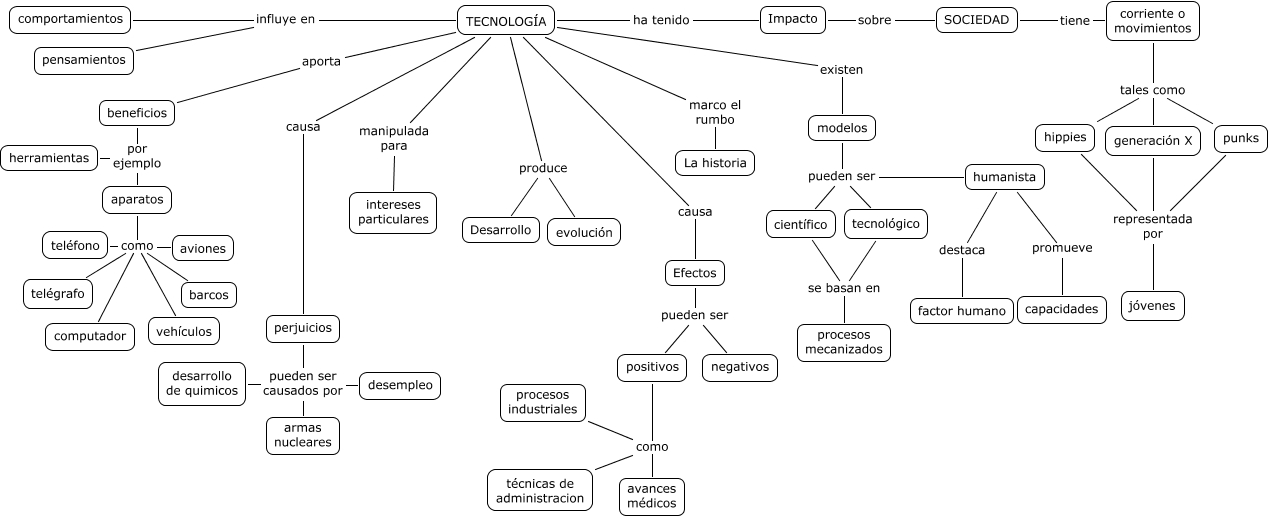 Este Cmap, tiene información relacionada con: Bertha Córdoba, hippies representada por jóvenes, Efectos pueden ser negativos, beneficios por ejemplo aparatos, aparatos como telégrafo, corriente o movimientos tales como generación X, TECNOLOGÍA existen modelos, corriente o movimientos tales como punks, aparatos como aviones, aparatos como barcos, punks representada por jóvenes, TECNOLOGÍA causa perjuicios, perjuicios pueden ser causados por desempleo, beneficios por ejemplo herramientas, tecnológico se basan en procesos mecanizados, aparatos como vehículos, aparatos como teléfono, TECNOLOGÍA aporta beneficios, perjuicios pueden ser causados por armas nucleares, generación X representada por jóvenes, Efectos pueden ser positivos
