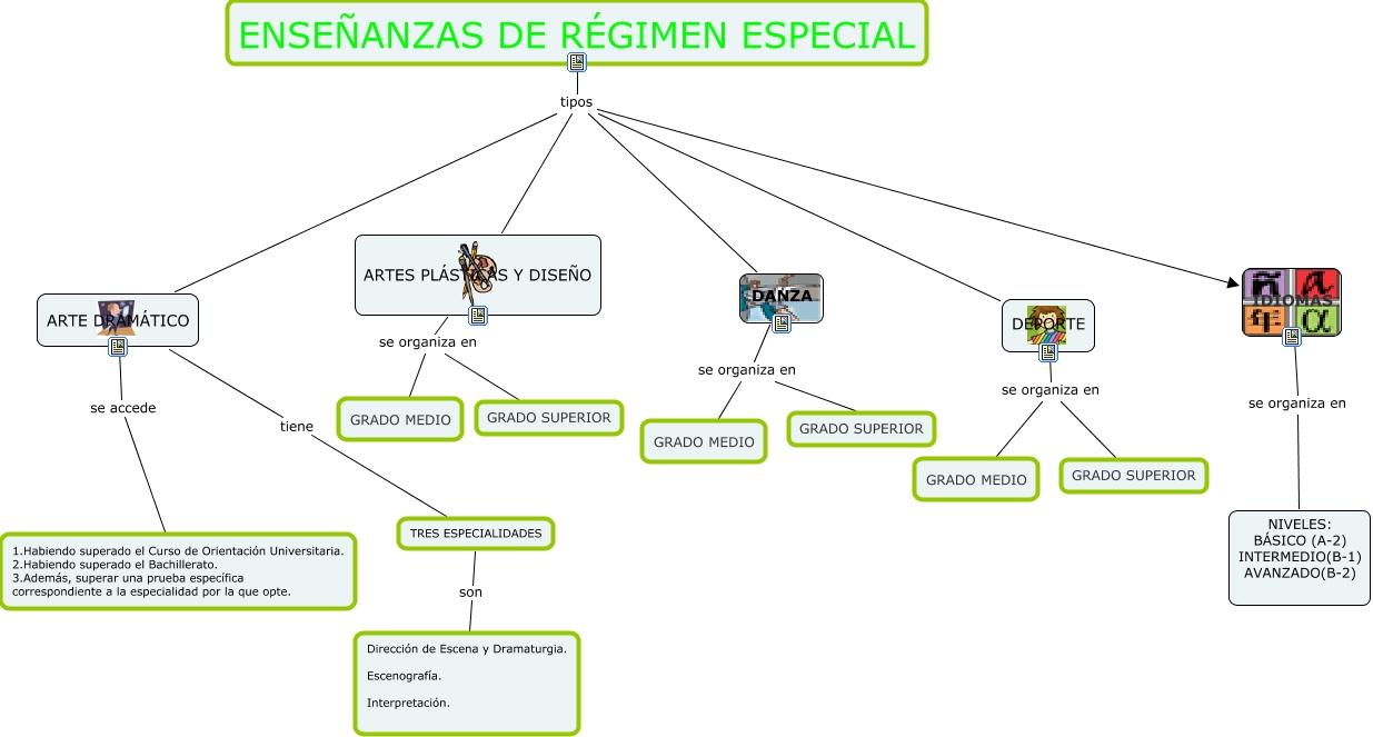 Este Cmap, tiene información relacionada con: ENSEÑANZAS DE RÉGIMEN ESPECIAL, TRES ESPECIALIDADES son Dirección de Escena y Dramaturgia. Escenografía. Interpretación., ARTES PLÁSTICAS Y DISEÑO se organiza en GRADO MEDIO, ARTE DRAMÁTICO se accede 1.Habiendo superado el Curso de Orientación Universitaria. 2.Habiendo superado el Bachillerato. 3.Además, superar una prueba específica correspondiente a la especialidad por la que opte., ENSEÑANZAS DE RÉGIMEN ESPECIAL tipos IDIOMAS, DEPORTE se organiza en GRADO SUPERIOR, ENSEÑANZAS DE RÉGIMEN ESPECIAL tipos ARTES PLÁSTICAS Y DISEÑO, ARTE DRAMÁTICO tiene TRES ESPECIALIDADES, DANZA se organiza en GRADO MEDIO, ARTES PLÁSTICAS Y DISEÑO se organiza en GRADO SUPERIOR, IDIOMAS se organiza en NIVELES: BÁSICO (A-2) INTERMEDIO(B-1) AVANZADO(B-2), ENSEÑANZAS DE RÉGIMEN ESPECIAL tipos DANZA, DEPORTE se organiza en GRADO MEDIO, ENSEÑANZAS DE RÉGIMEN ESPECIAL tipos ARTE DRAMÁTICO, DANZA se organiza en GRADO SUPERIOR, ENSEÑANZAS DE RÉGIMEN ESPECIAL tipos DEPORTE