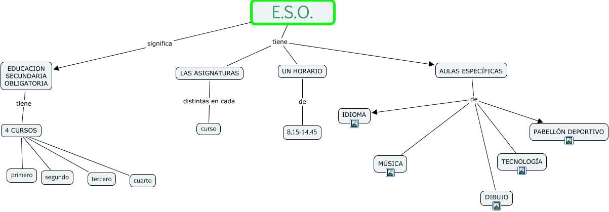 Este Cmap, tiene información relacionada con: QUÉ ES LA ESO, 4 CURSOS ???? cuarto, E.S.O. significa EDUCACION SECUNDARIA OBLIGATORIA, 4 CURSOS ???? segundo, 4 CURSOS ???? primero, AULAS ESPECÍFICAS de PABELLÓN DEPORTIVO, LAS ASIGNATURAS distintas en cada curso, E.S.O. tiene UN HORARIO, 4 CURSOS ???? tercero, EDUCACION SECUNDARIA OBLIGATORIA tiene 4 CURSOS, E.S.O. tiene LAS ASIGNATURAS, UN HORARIO de 8,15-14,45, AULAS ESPECÍFICAS de IDIOMA, E.S.O. tiene AULAS ESPECÍFICAS, AULAS ESPECÍFICAS de DIBUJO, AULAS ESPECÍFICAS de MÚSICA, AULAS ESPECÍFICAS de TECNOLOGÍA