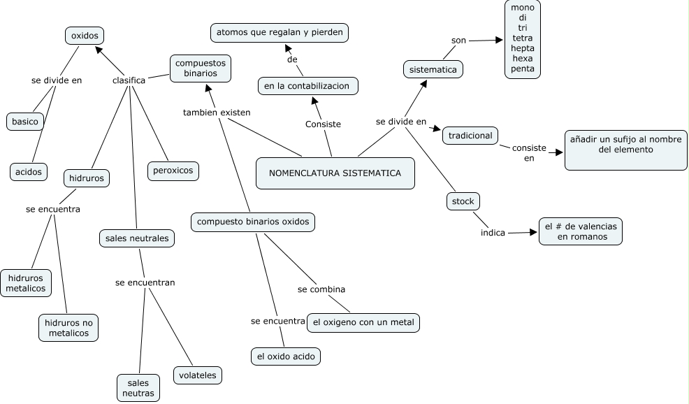 Este Cmap, tiene información relacionada con: nomenclatura inorganica paula obando 10c, tradicional consiste en añadir un sufijo al nombre del elemento, hidruros se encuentra hidruros metalicos, oxidos se divide en basico, NOMENCLATURA SISTEMATICA se divide en tradicional, hidruros se encuentra hidruros no metalicos, sistematica son mono di tri tetra hepta hexa penta, NOMENCLATURA SISTEMATICA tambien existen compuesto binarios oxidos, compuestos binarios clasifica sales neutrales, NOMENCLATURA SISTEMATICA tambien existen compuestos binarios, compuestos binarios clasifica hidruros, NOMENCLATURA SISTEMATICA se divide en stock, compuesto binarios oxidos se combina el oxigeno con un metal, sales neutrales se encuentran sales neutras, NOMENCLATURA SISTEMATICA se divide en sistematica, NOMENCLATURA SISTEMATICA Consiste en la contabilizacion, compuesto binarios oxidos se encuentra el oxido acido, stock indica el # de valencias en romanos, sales neutrales se encuentran volateles, en la contabilizacion de atomos que regalan y pierden, compuestos binarios clasifica oxidos