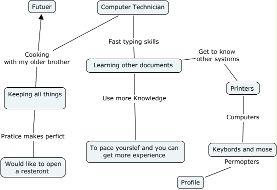 This Concept Map, created with IHMC CmapTools, has information related to: Sam the man Piazza, Computer Technician Cooking with my older brother Keeping all things, Keybords and mose Permopters Profile, Keeping all things Pratice makes perfict Would like to open a resteront, Printers Computers Keybords and mose, Computer Technician Cooking with my older brother Futuer, Learning other documents Use more Knowledge To pace yourslef and you can get more experience, Learning other documents Get to know other systoms Printers, Computer Technician Fast typing skills Learning other documents