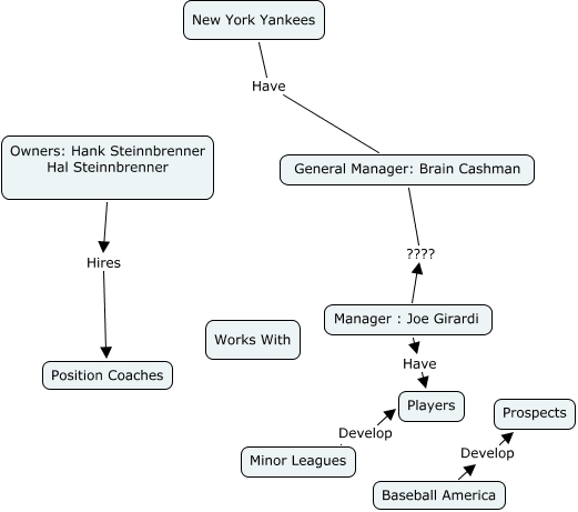 This Concept Map, created with IHMC CmapTools, has information related to: New York Yankees, Minor Leagues Develop Players, Manager : Joe Girardi Have Players, Baseball America Develop Prospects, New York Yankees Have General Manager: Brain Cashman, Owners: Hank Steinnbrenner Hal Steinnbrenner Hires Position Coaches