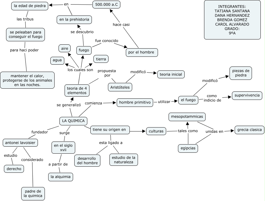 Este Cmap, tiene información relacionada con: Mapa conceptual de alquimia del grado 9ºa, el fuego como indicio de supervivencia, teoria de 4 elementos propuesta por Aristóteles, culturas tales como mesopotammicas, fuego se descubrio en la prehistoria, mesopotammicas unidas en grecia clasica, antonei lavoisier estudio derecho, en la prehistoria en la edad de piedra, tiene su origen en esta ligado a desarrollo del hombre, la edad de piedra las tribus se peleaban para conseguir el fuego, LA QUIMICA fundador antonei lavoisier, fuego fue conocido por el hombre, hombre primitivo utilizar el fuego, LA QUIMICA comienza hombre primitivo, teoria de 4 elementos los cuales son aire, mesopotammicas unidas en egipcias, teoria de 4 elementos los cuales son tierra, teoria de 4 elementos los cuales son fuego, en el siglo xvii a partir de la alquimia, 500.000 a.C en la edad de piedra, por el hombre hace casi 500.000 a.C