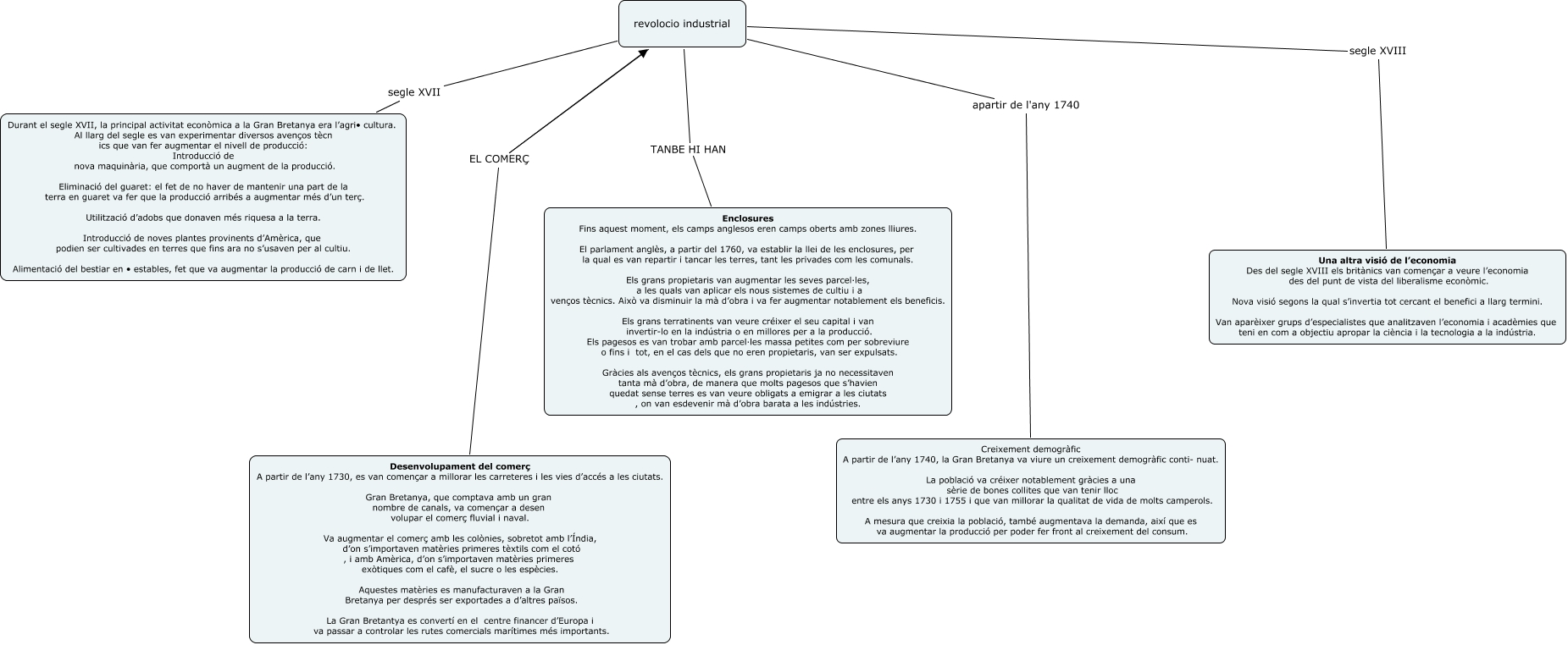 Aquest mapa conceptual conté informació relacionada amb: revolucio_industrial, revolocio industrial EL COMERÇ Desenvolupament del comerç A partir de l’any 1730, es van començar a millorar les carreteres i les vies d’accés a les ciutats. Gran Bretanya, que comptava amb un gran nombre de canals, va començar a desen volupar el comerç fluvial i naval. Va augmentar el comerç amb les colònies, sobretot amb l’Índia, d’on s’importaven matèries primeres tèxtils com el cotó , i amb Amèrica, d’on s’importaven matèries primeres exòtiques com el cafè, el sucre o les espècies. Aquestes matèries es manufacturaven a la Gran Bretanya per després ser exportades a d’altres països. La Gran Bretantya es convertí en el centre financer d’Europa i va passar a controlar les rutes comercials marítimes més importants., revolocio industrial segle XVIII Una altra visió de l’economia Des del segle XVIII els britànics van començar a veure l’economia des del punt de vista del liberalisme econòmic. Nova visió segons la qual s’invertia tot cercant el benefici a llarg termini. Van aparèixer grups d’especialistes que analitzaven l’economia i acadèmies que teni en com a objectiu apropar la ciència i la tecnologia a la indústria., revolocio industrial TANBE HI HAN Enclosures Fins aquest moment, els camps anglesos eren camps oberts amb zones lliures. El parlament anglès, a partir del 1760, va establir la llei de les enclosures, per la qual es van repartir i tancar les terres, tant les privades com les comunals. Els grans propietaris van augmentar les seves parcel·les, a les quals van aplicar els nous sistemes de cultiu i a venços tècnics. Això va disminuir la mà d’obra i va fer augmentar notablement els beneficis. Els grans terratinents van veure créixer el seu capital i van invertir-lo en la indústria o en millores per a la producció. Els pagesos es van trobar amb parcel·les massa petites com per sobreviure o fins i tot, en el cas dels que no eren propietaris, van ser expulsats. Gràcies als avenços tècnics, els grans propietaris ja no necessitaven tanta mà d’obra, de manera que molts pagesos que s’havien quedat sense terres es van veure obligats a emigrar a les ciutats , on van esdevenir mà d’obra barata a les indústries., revolocio industrial apartir de l'any 1740 Creixement demogràfic A partir de l’any 1740, la Gran Bretanya va viure un creixement demogràfic conti- nuat. La població va créixer notablement gràcies a una sèrie de bones collites que van tenir lloc entre els anys 1730 i 1755 i que van millorar la qualitat de vida de molts camperols. A mesura que creixia la població, també augmentava la demanda, així que es va augmentar la producció per poder fer front al creixement del consum., revolocio industrial segle XVII Durant el segle XVII, la principal activitat econòmica a la Gran Bretanya era l’agri• cultura. Al llarg del segle es van experimentar diversos avenços tècn ics que van fer augmentar el nivell de producció: Introducció de nova maquinària, que comportà un augment de la producció. Eliminació del guaret: el fet de no haver de mantenir una part de la terra en guaret va fer que la producció arribés a augmentar més d’un terç. Utilització d’adobs que donaven més riquesa a la terra. Introducció de noves plantes provinents d’Amèrica, que podien ser cultivades en terres que fins ara no s’usaven per al cultiu. Alimentació del bestiar en • estables, fet que va augmentar la producció de carn i de llet.