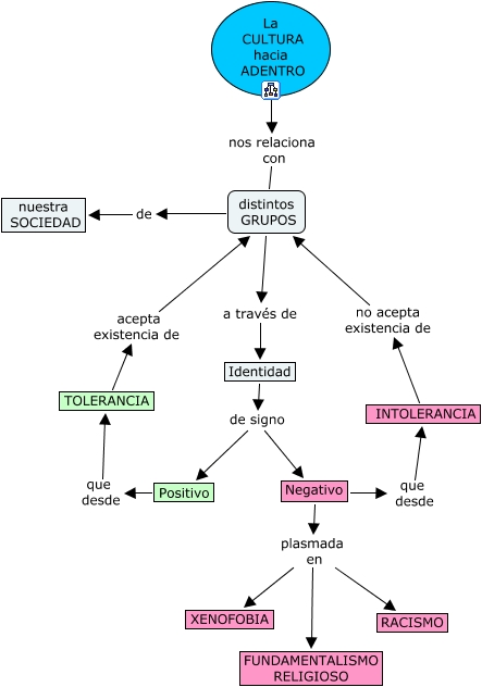 Este Cmap, tiene información relacionada con: cultura-ad, INTOLERANCIA no acepta existencia de distintos GRUPOS, Negativo plasmada en RACISMO, Positivo que desde TOLERANCIA, Negativo plasmada en FUNDAMENTALISMO RELIGIOSO, Negativo plasmada en XENOFOBIA, TOLERANCIA acepta existencia de distintos GRUPOS, Negativo que desde INTOLERANCIA, distintos GRUPOS de nuestra SOCIEDAD, distintos GRUPOS a través de Identidad, Identidad de signo Negativo, Identidad de signo Positivo, La CULTURA hacia ADENTRO nos relaciona con distintos GRUPOS