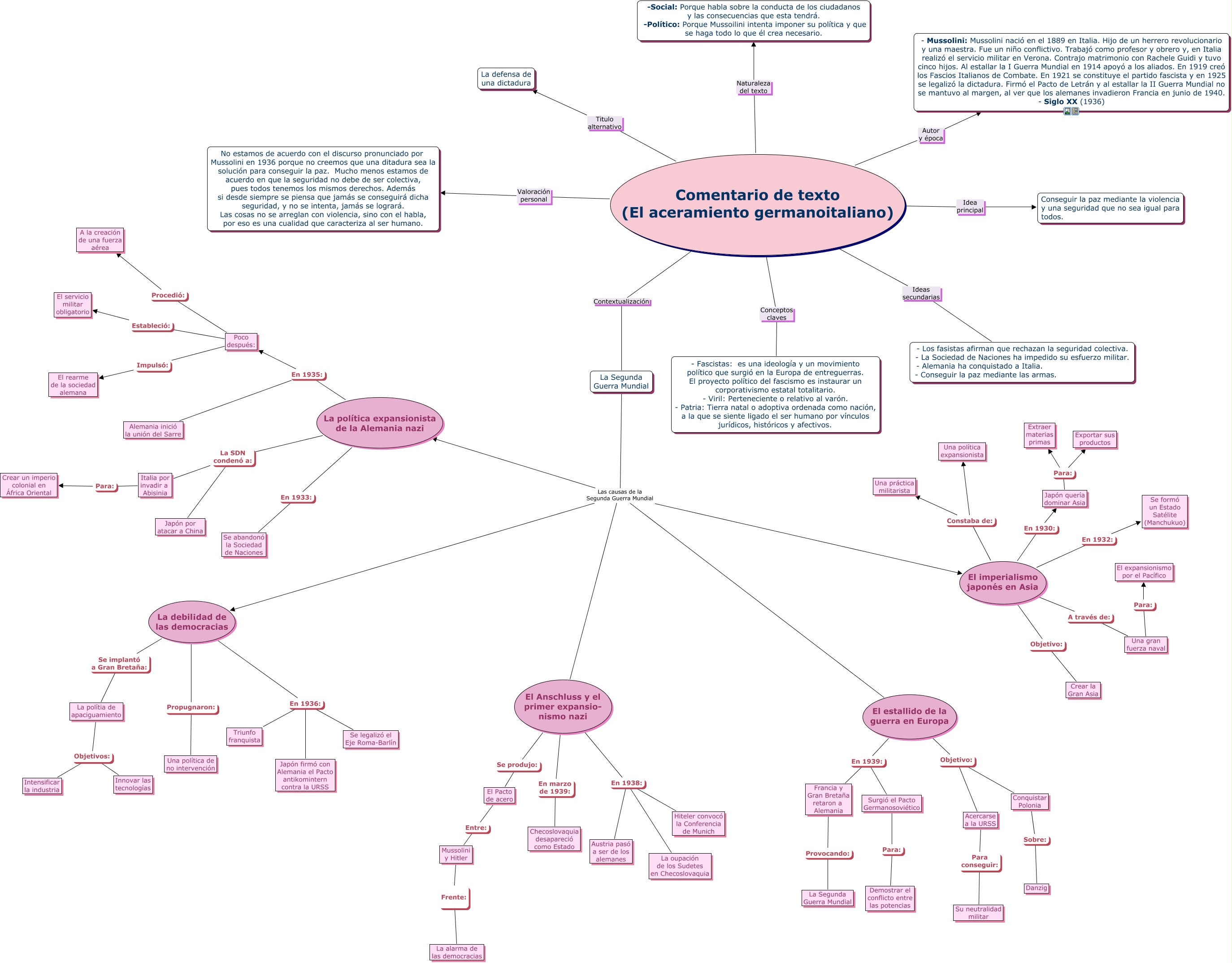 Este Cmap, tiene información relacionada con: Comentario 1, Comentario de texto (El aceramiento germanoitaliano) Contextualización La Segunda Guerra Mundial, La política expansionista de la Alemania nazi En 1935: Alemania inició la unión del Sarre, La Segunda Guerra Mundial Las causas de la Segunda Guerra Mundial El Anschluss y el primer expansio- nismo nazi, La debil¡dad de las democracias Propugnaron: Una política de no intervención, El estallido de la guerra en Europa Objetivo: Conquistar Polonia, El estallido de la guerra en Europa En 1939: Surgió el Pacto Germanosoviético, La polítia de apaciguamiento Objetivos: Innovar las tecnologías, La política expansionista de la Alemania nazi La SDN condenó a: Italia por invadir a Abisinia, Surgió el Pacto Germanosoviético Para: Demostrar el conflicto entre las potencias, La debil¡dad de las democracias En 1936: Japón firmó con Alemania el Pacto antikomintern contra la URSS, La Segunda Guerra Mundial Las causas de la Segunda Guerra Mundial El imperialismo japonés en Asia, La política expansionista de la Alemania nazi En 1935: Poco después:, Mussolini y Hitler Frente: La alarma de las democracias, El Anschluss y el primer expansio- nismo nazi Se produjo: El Pacto de acero, Comentario de texto (El aceramiento germanoitaliano) Conceptos claves - Fascistas: es una ideología y un movimiento político que surgió en la Europa de entreguerras. El proyecto político del fascismo es instaurar un corporativismo estatal totalitario. - Viril: Perteneciente o relativo al varón. - Patria: Tierra natal o adoptiva ordenada como nación, a la que se siente ligado el ser humano por vínculos jurídicos, históricos y afectivos., Comentario de texto (El aceramiento germanoitaliano) Autor y época - Mussolini: Mussolini nació en el 1889 en Italia. Hijo de un herrero revolucionario y una maestra. Fue un niño conflictivo. Trabajó como profesor y obrero y, en Italia realizó el servicio militar en Verona. Contrajo matrimonio con Rachele Guidi y tuvo cinco hijos. Al estallar la I Guerra Mundial en 1914 apoyó a los aliados. En 1919 creó los Fascios Italianos de Combate. En 1921 se constituye el partido fascista y en 1925 se legalizó la dictadura. Firmó el Pacto de Letrán y al estallar la II Guerra Mundial no se mantuvo al margen, al ver que los alemanes invadieron Francia en junio de 1940. - Siglo XX (1936), La Segunda Guerra Mundial Las causas de la Segunda Guerra Mundial La debil¡dad de las democracias, La debil¡dad de las democracias Se implantó a Gran Bretaña: La polítia de apaciguamiento, Comentario de texto (El aceramiento germanoitaliano) Idea principal Conseguir la paz mediante la violencia y una seguridad que no sea igual para todos., Italia por invadir a Abisinia Para: Crear un imperio colonial en África Oriental
