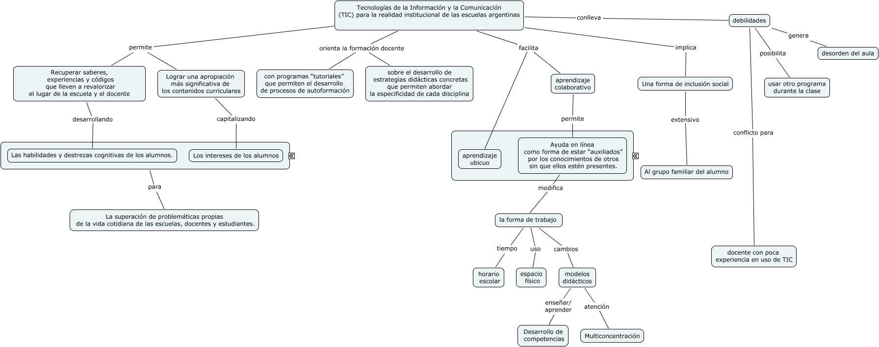 Este Cmap, tiene información relacionada con: TICRODRIGUEZALIC, Recuperar saberes, experiencias y códigos que lleven a revalorizar el lugar de la escuela y el docente desarrollando Las habilidades y destrezas cognitivas de los alumnos., Tecnologías de la Información y la Comunicación (TIC) para la realidad institucional de las escuelas argentinas orienta la formación docente con programas “tutoriales” que permiten el desarrollo de procesos de autoformación, la forma de trabajo tiempo horario escolar, debilidades posibilita usar otro programa durante la clase, Una forma de inclusión social extensivo Al grupo familiar del alumno, Tecnologías de la Información y la Comunicación (TIC) para la realidad institucional de las escuelas argentinas permite Recuperar saberes, experiencias y códigos que lleven a revalorizar el lugar de la escuela y el docente, Tecnologías de la Información y la Comunicación (TIC) para la realidad institucional de las escuelas argentinas permite Lograr una apropiación más significativa de los contenidos curriculares, Tecnologías de la Información y la Comunicación (TIC) para la realidad institucional de las escuelas argentinas orienta la formación docente sobre el desarrollo de estrategias didácticas concretas que permiten abordar la especificidad de cada disciplina, Ayuda en línea como forma de estar “auxiliados” por los conocimientos de otros sin que ellos estén presentes. modifica la forma de trabajo, debilidades conflicto para docente con poca experiencia en uso de TIC, modelos didácticos enseñar/ aprender Desarrollo de competencias, aprendizaje colaborativo permite Ayuda en línea como forma de estar “auxiliados” por los conocimientos de otros sin que ellos estén presentes., Tecnologías de la Información y la Comunicación (TIC) para la realidad institucional de las escuelas argentinas facilita aprendizaje ubicuo, Lograr una apropiación más significativa de los contenidos curriculares capitalizando Los intereses de los alumnos, la forma de trabajo uso espacio físico, Tecnologías de la Información y la Comunicación (TIC) para la realidad institucional de las escuelas argentinas conlleva debilidades, modelos didácticos atención Multiconcentración, Tecnologías de la Información y la Comunicación (TIC) para la realidad institucional de las escuelas argentinas implica Una forma de inclusión social, debilidades genera desorden del aula, Tecnologías de la Información y la Comunicación (TIC) para la realidad institucional de las escuelas argentinas facilita aprendizaje colaborativo