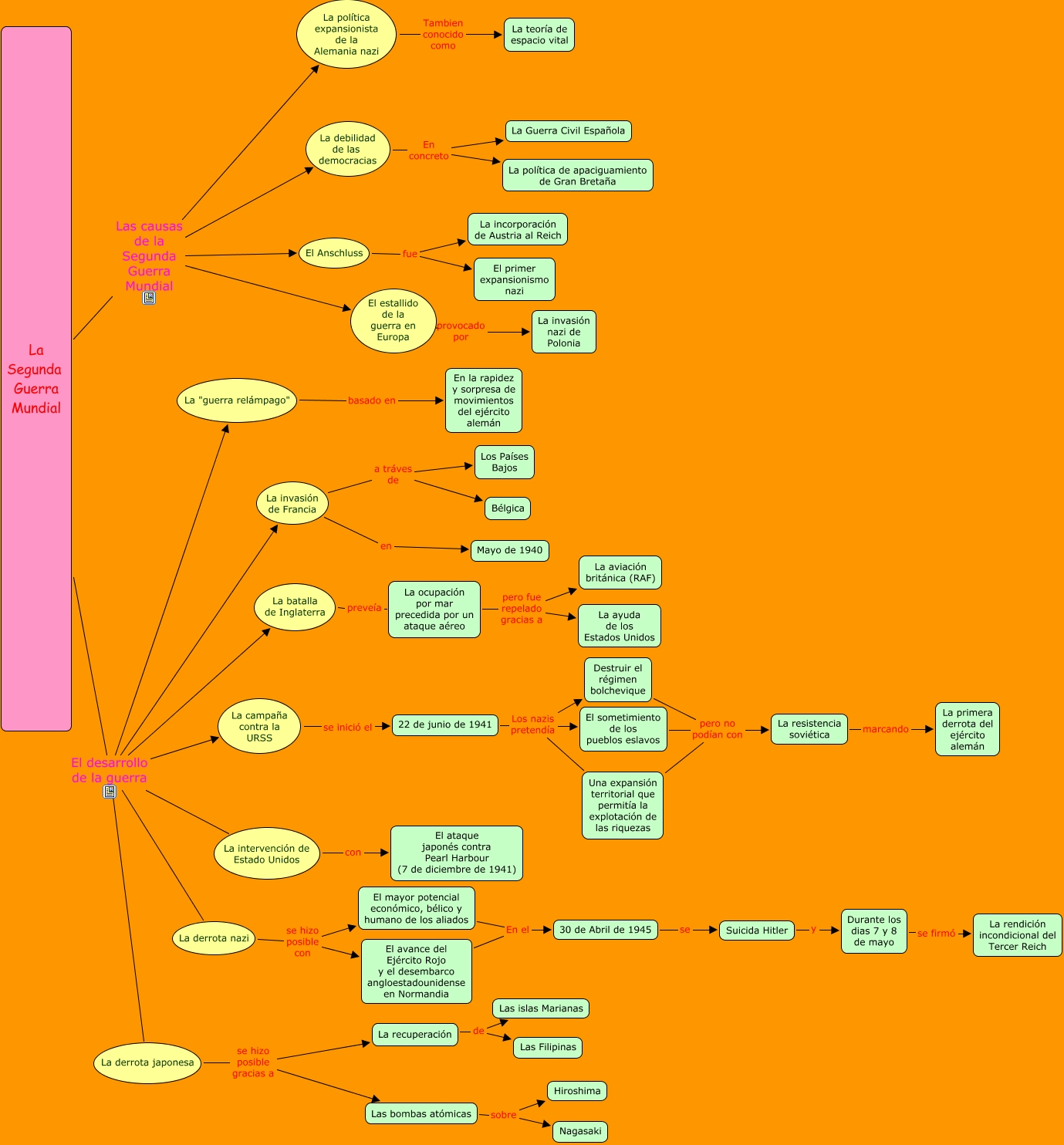 Este Cmap, tiene información relacionada con: Primera parte Tema 10, La Segunda Guerra Mundial El desarrollo de la guerra La "guerra relámpago", La intervención de Estado Unidos con El ataque japonés contra Pearl Harbour (7 de diciembre de 1941), Durante los dias 7 y 8 de mayo se firmó La rendición incondicional del Tercer Reich, El Anschluss fue El primer expansionismo nazi, La ocupación por mar precedida por un ataque aéreo pero fue repelado gracias a La aviación británica (RAF), Destruir el régimen bolchevique pero no podían con La resistencia soviética, El Anschluss fue La incorporación de Austria al Reich, El mayor potencial económico, bélico y humano de los aliados En el 30 de Abril de 1945, La batalla de Inglaterra preveía La ocupación por mar precedida por un ataque aéreo, La derrota nazi se hizo posible con El mayor potencial económico, bélico y humano de los aliados, La recuperación de Las islas Marianas, Una expansión territorial que permitía la explotación de las riquezas pero no podían con La resistencia soviética, La Segunda Guerra Mundial Las causas de la Segunda Guerra Mundial El Anschluss, La Segunda Guerra Mundial El desarrollo de la guerra La intervención de Estado Unidos, El avance del Ejército Rojo y el desembarco angloestadounidense en Normandia En el 30 de Abril de 1945, La derrota nazi se hizo posible con El avance del Ejército Rojo y el desembarco angloestadounidense en Normandia, La debilidad de las democracias En concreto La política de apaciguamiento de Gran Bretaña, La campaña contra la URSS se inició el 22 de junio de 1941, Las bombas atómicas sobre Hiroshima, La "guerra relámpago" basado en En la rapidez y sorpresa de movimientos del ejército alemán