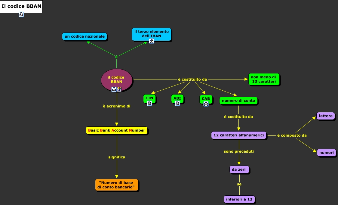 Il codice BBAN, Basic Bank Account Number significa "Numero di base di conto bancario", il codice BBAN è costituito da ABI, 12 caratteri alfanumerici sono preceduti da zeri, da zeri se inferiori a 12, il codice BBAN è costituito da CAB, numero di conto è costituito da 12 caratteri alfanumerici, il codice BBAN è costituito da CIN, il codice BBAN è costituito da numero di conto, il codice BBAN è il terzo elemento dell'IBAN, il codice BBAN è acronimo di Basic Bank Account Number