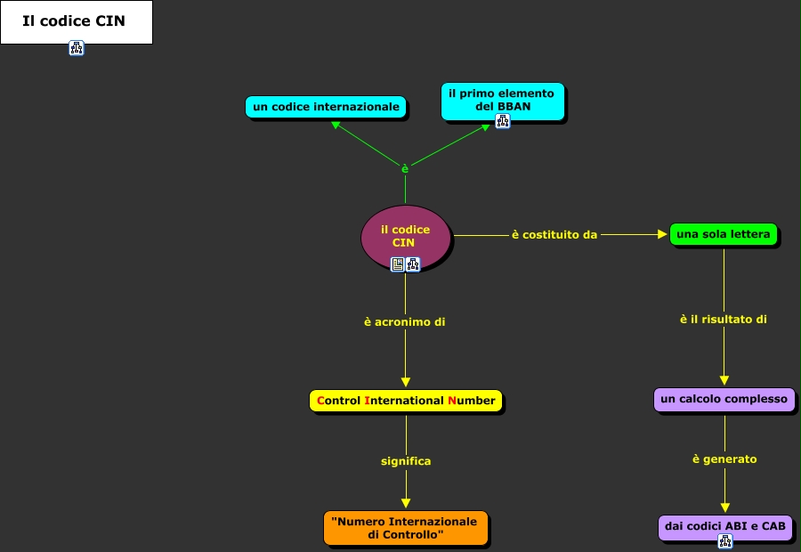 Il codice CIN, il codice CIN è il primo elemento del BBAN, un calcolo complesso è generato dai codici ABI e CAB, il codice CIN è un codice internazionale, Control International Number significa "Numero Internazionale di Controllo", il codice CIN è costituito da una sola lettera, il codice CIN è acronimo di Control International Number, una sola lettera è il risultato di un calcolo complesso